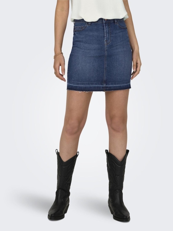 Dit stretch denim rokje is een 5 pocket model met rafelrand aan de onderkant.