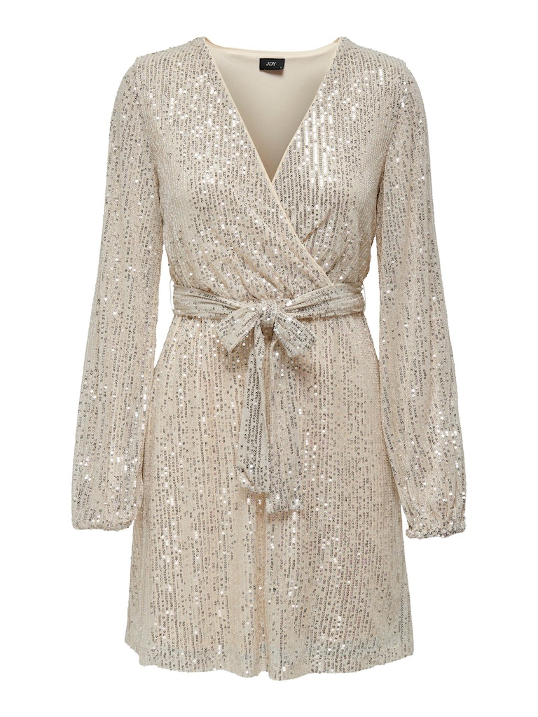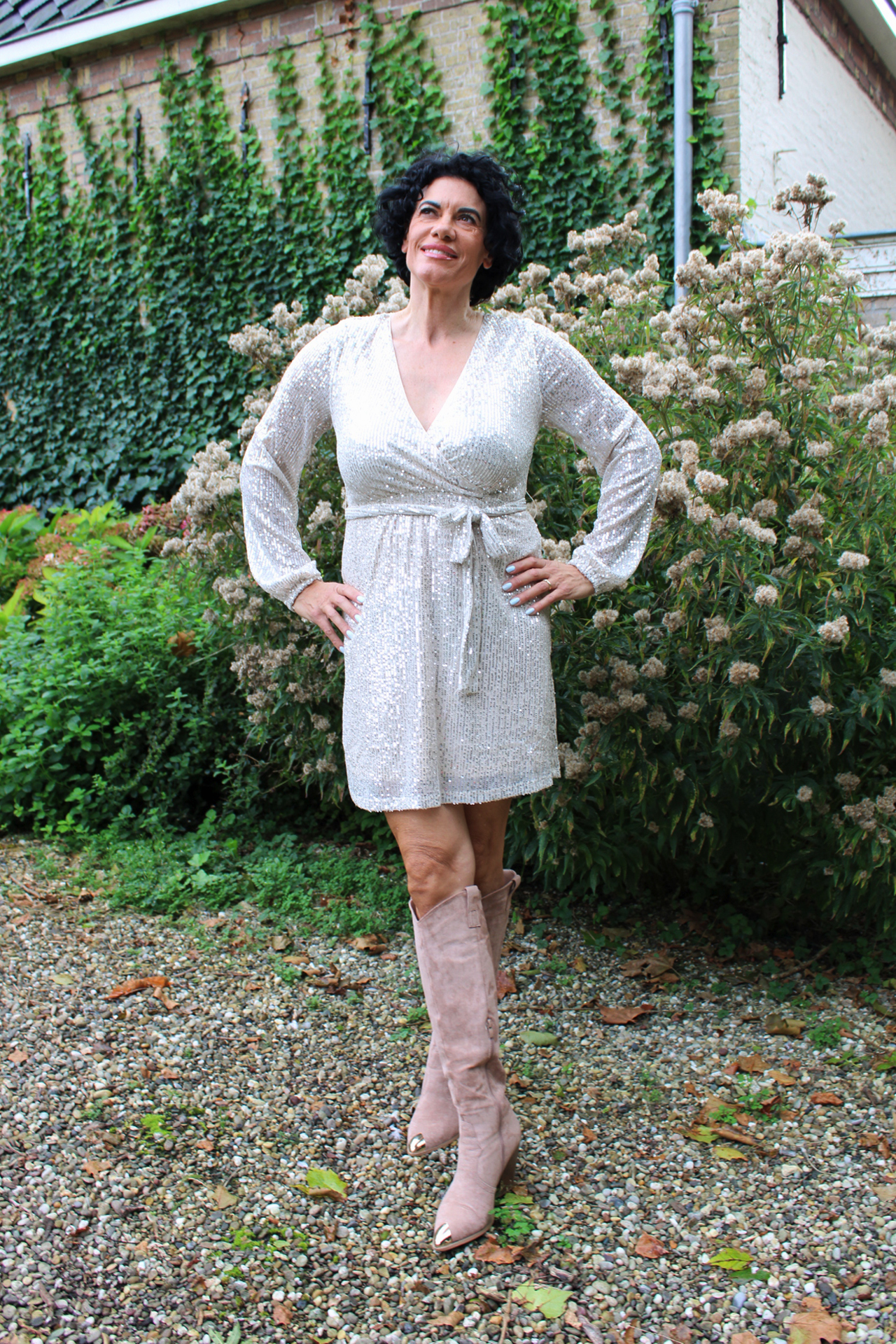 Dit vrolijke overslag jurkje vol met zilverkleurige pailletten heeft een ceintuurtje in de middel.