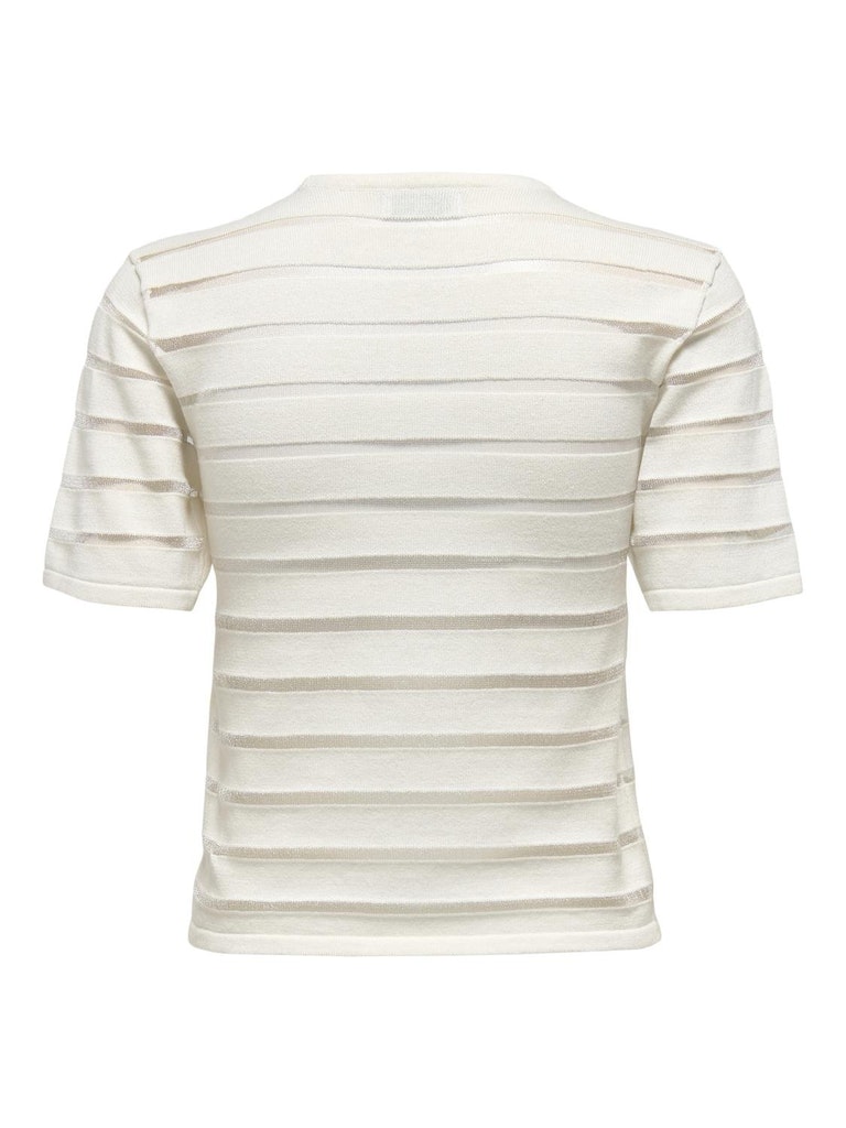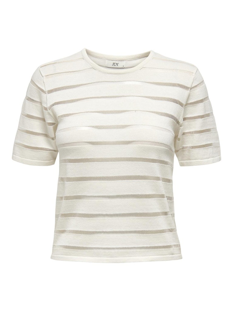 Dit T-shirt heeft een horizontaal streeppatroon waarvan de strepen doorschijnend zijn.