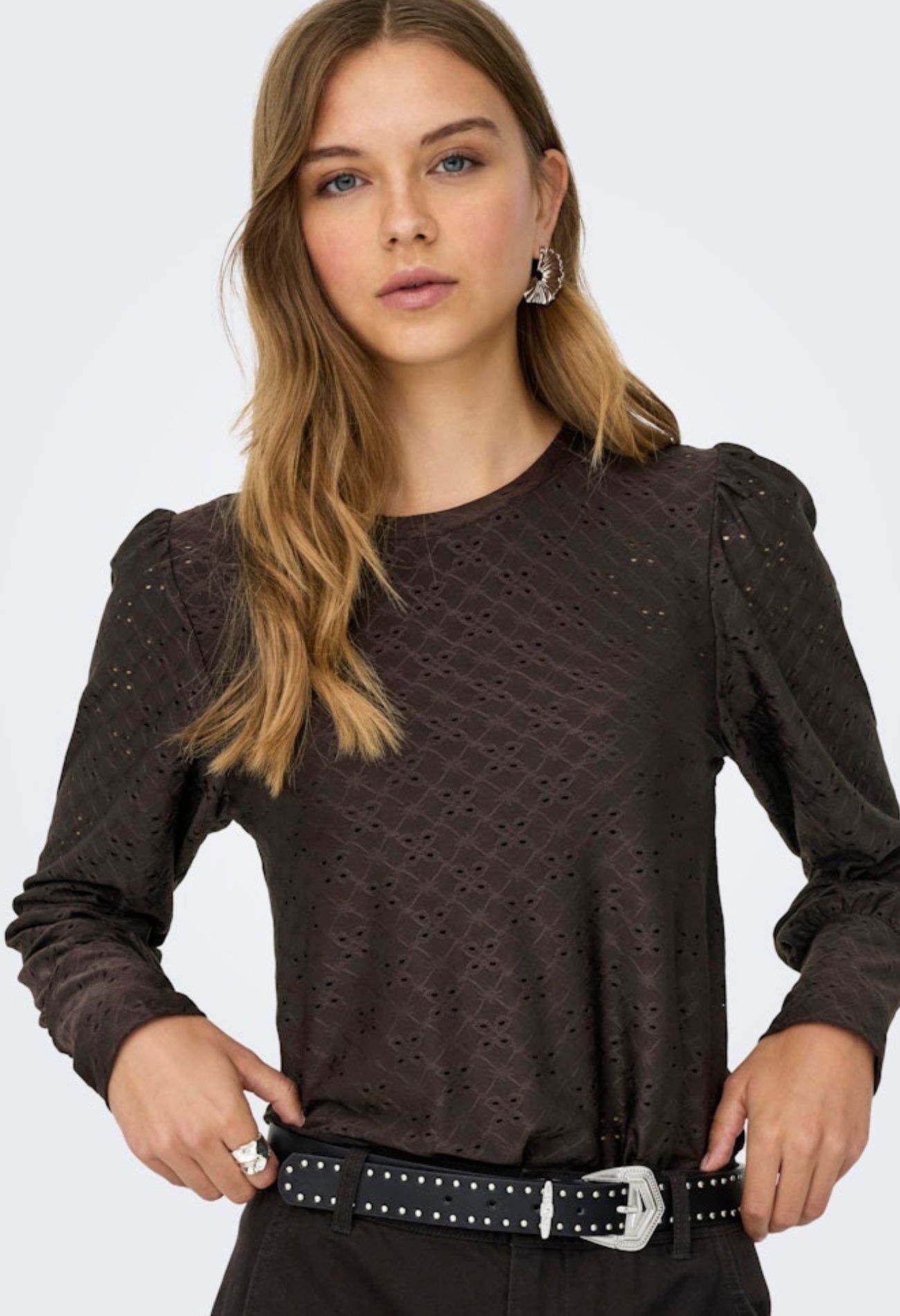 Deze top van ajour heeft een pofmouw inzet met lange manchetten. Draag een hemdje onder deze top om doorschijnen te voorkomen. Combineer het met een warm giletje of leuke blazer voor een trendy chique stijl.