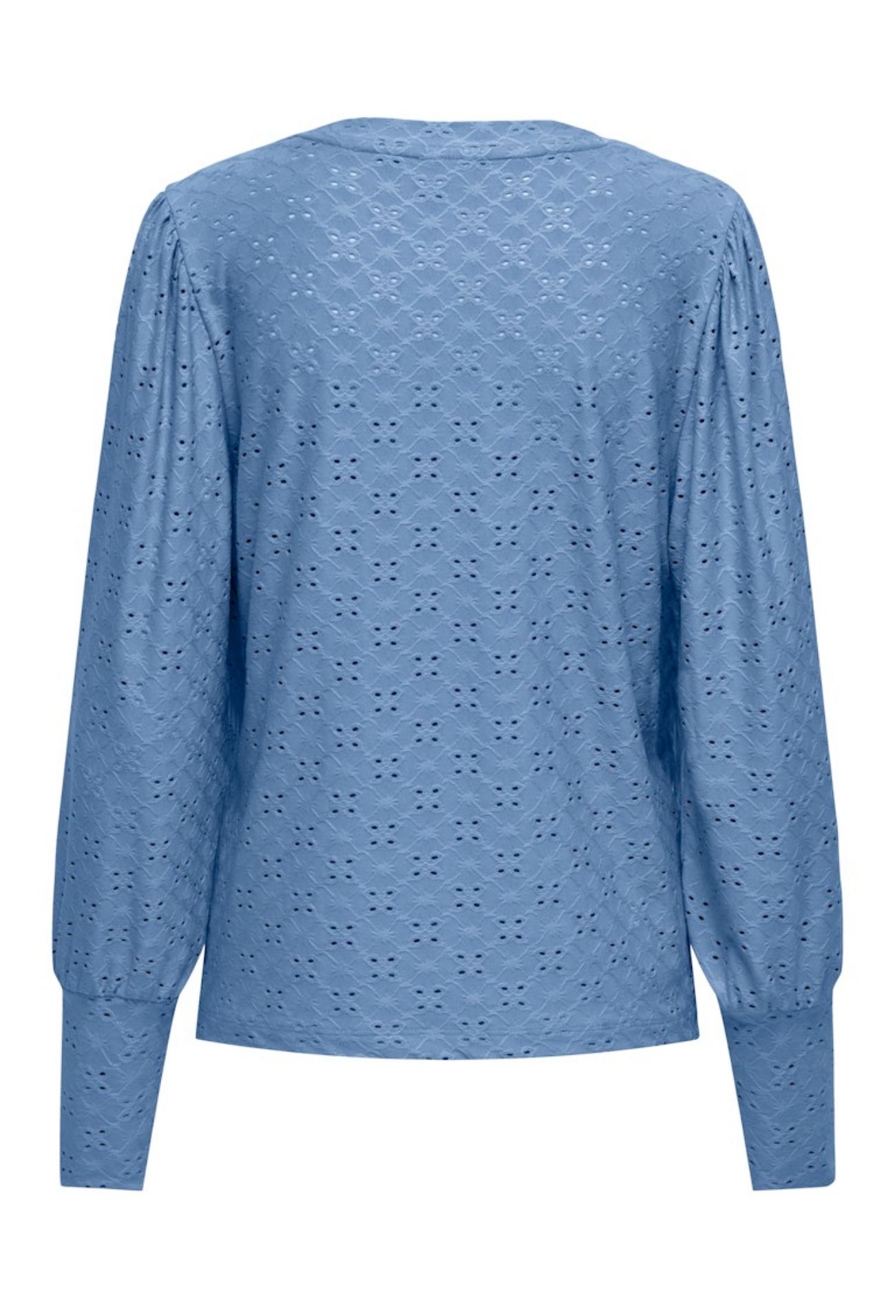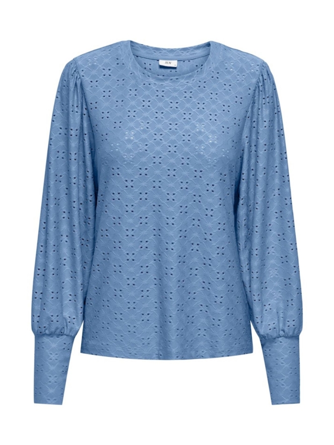 Deze top van ajour heeft een pofmouw inzet met lange manchetten. Draag een hemdje onder deze top om doorschijnen te voorkomen. Combineer het met een warm giletje of leuke blazer voor een trendy chique stijl.