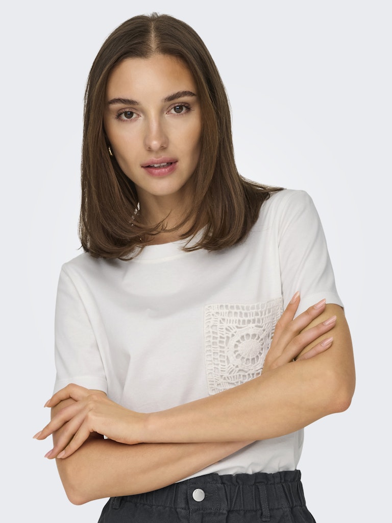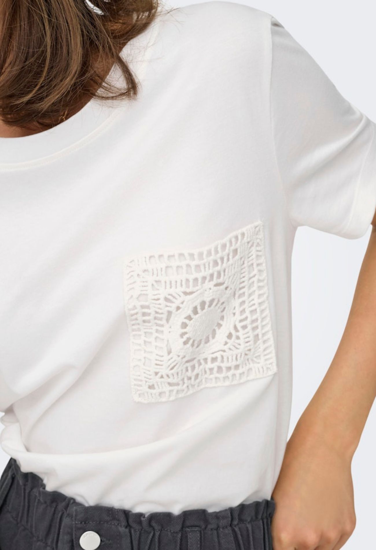 Dit T-shirt met crocket zakje is net even anders dan je gewend bent maar een hot item! Crocket is helemaal trendy deze zomer en zo op een effen item is een super leuke toegevoegde waarde. Met dit shirt kan je alle kanten op. Combineert goed op jeans maar ook op een leuke rok! Mix en match!!