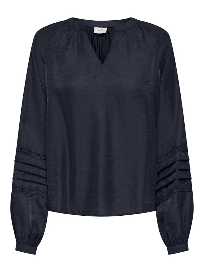 Prachtige ruim vallende effen gekleurde lace top van JDY met zeer fraaie mouwen. De ballonmouw heeft diverse plooien en ingezette sierbiezen met een doorschijnend bloemen patroon. Heb je de hals al gezien? Deze heeft een inkeping in de vorm van een V.