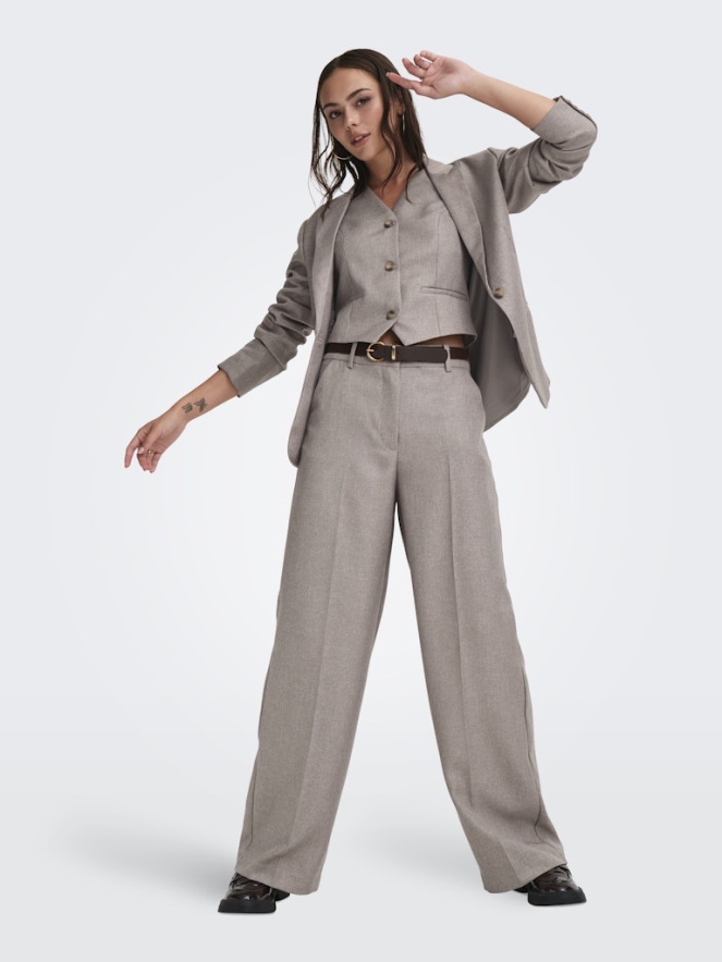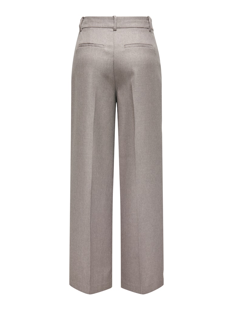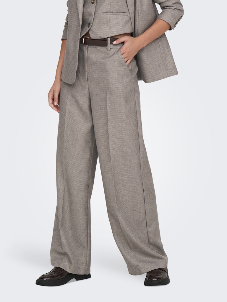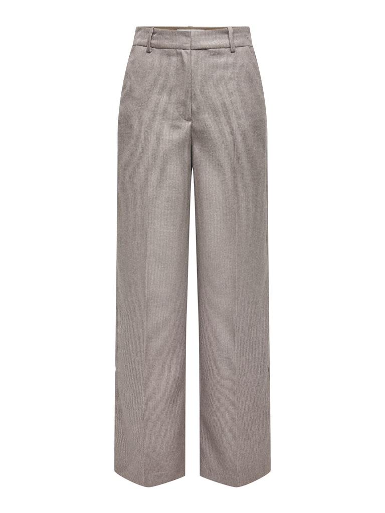 Deze broek is er een met wijde rechte broekspijpen. De broek heeft een minimalistisch ruitpatroon in bruintinten met twee steekzakken en twee sier paspelzakken achterop.