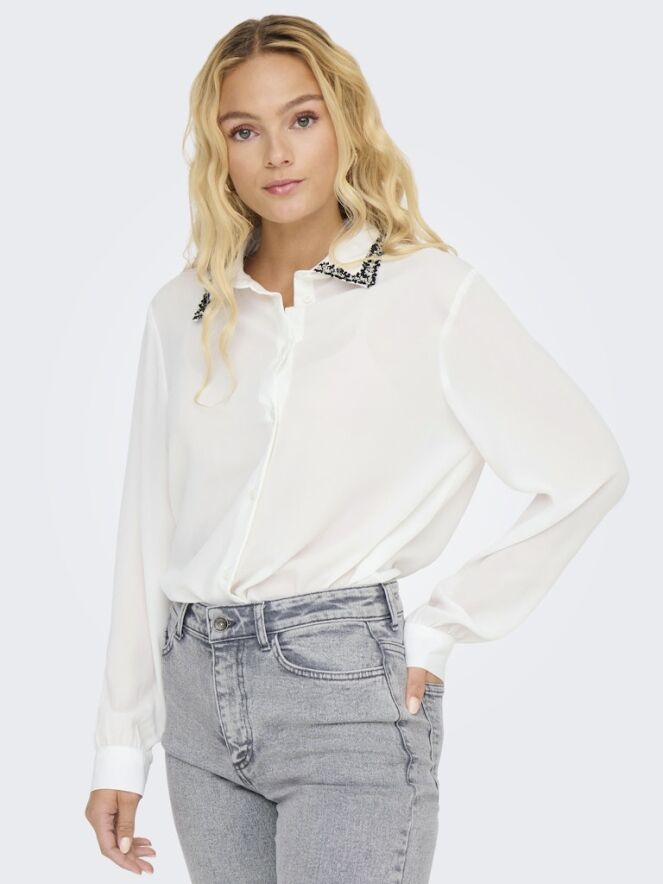 Fraaie blouse met Boucle biesje op de kraag. Deze blouse van chiffon doet chique aan en maakt jouw look helemaal compleet op een pantalon met een hak eronder.