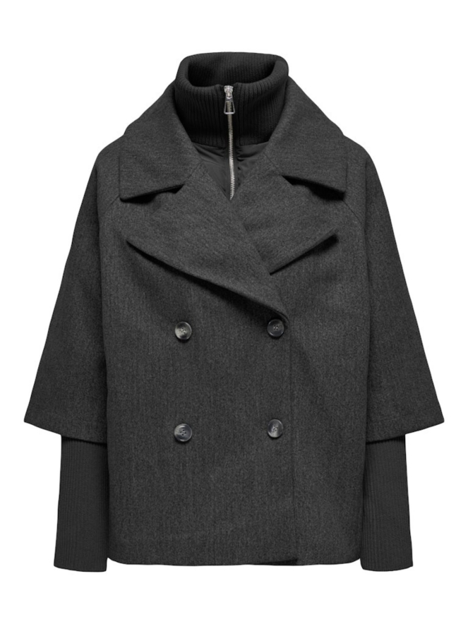 Korte trenchcoat met een twist! Deze warme variant heeft een uitritsbare binnenkant met warme kraag. Met dubbele rij knopen.