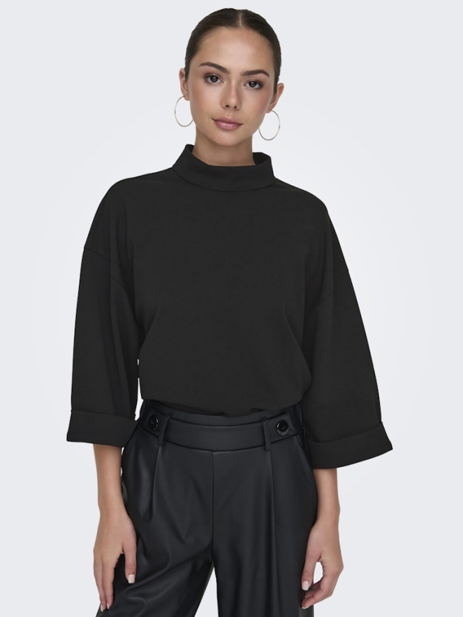 Zwarte oversized top van JDY met driekwart mouwen en hoge hals. Deze top sluit door middel van een blinde rits op de rug (15 cm ) met 2 knoopjes.