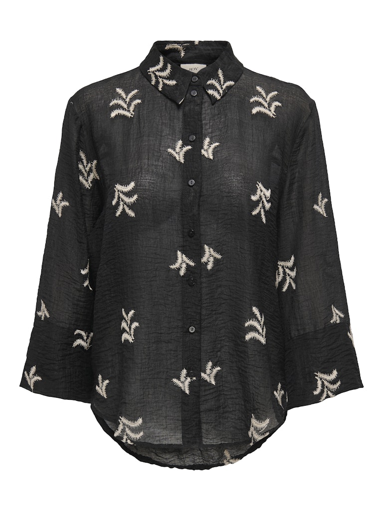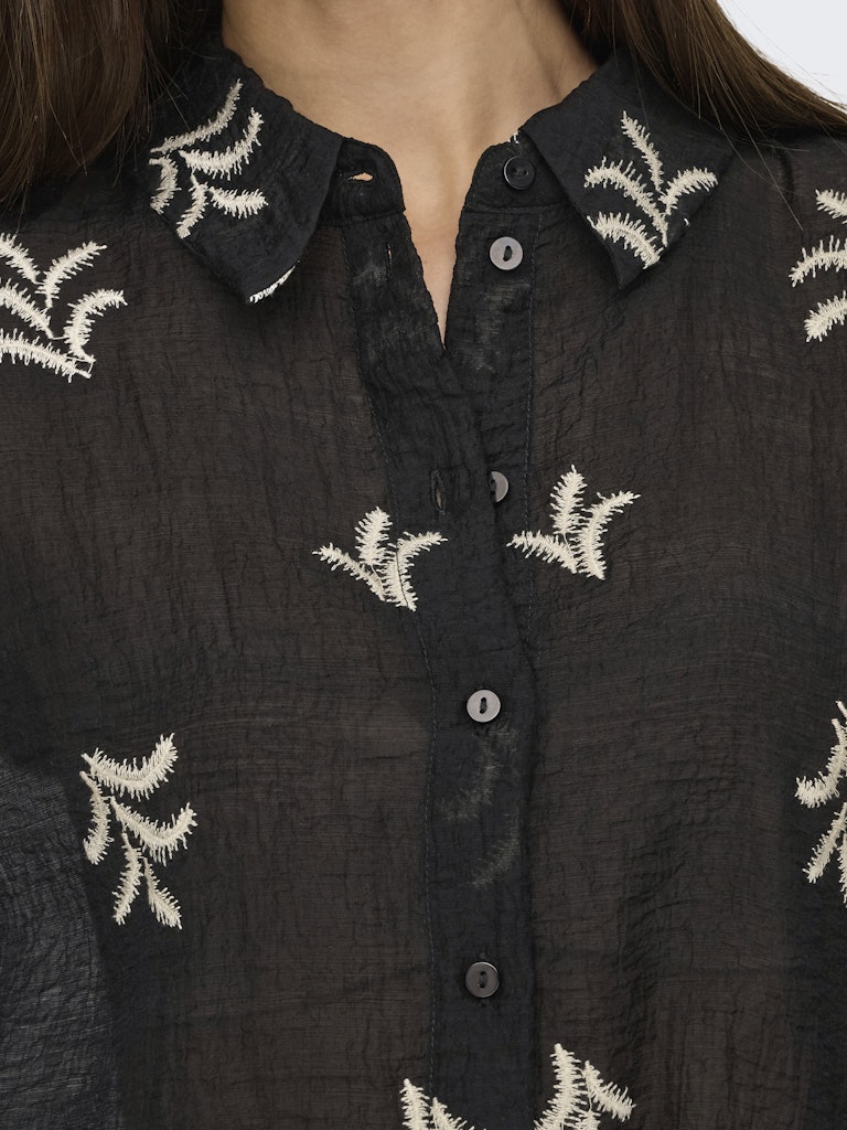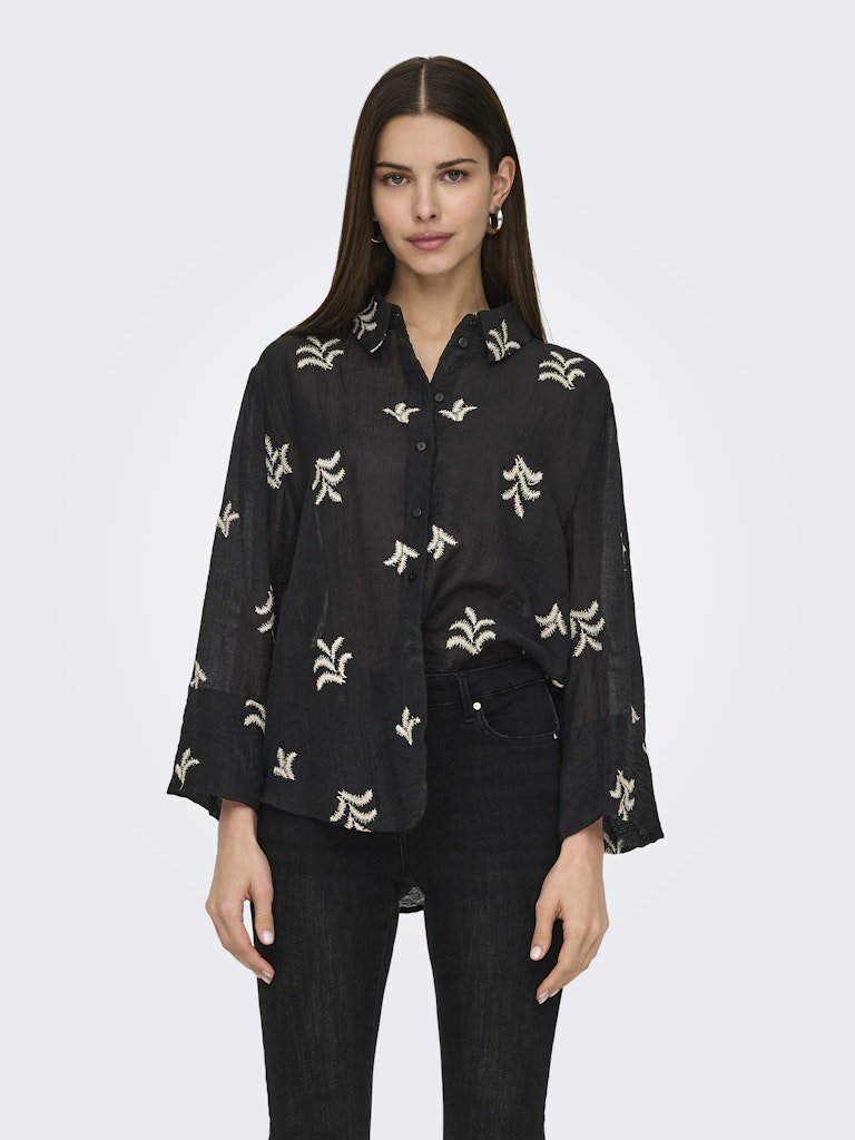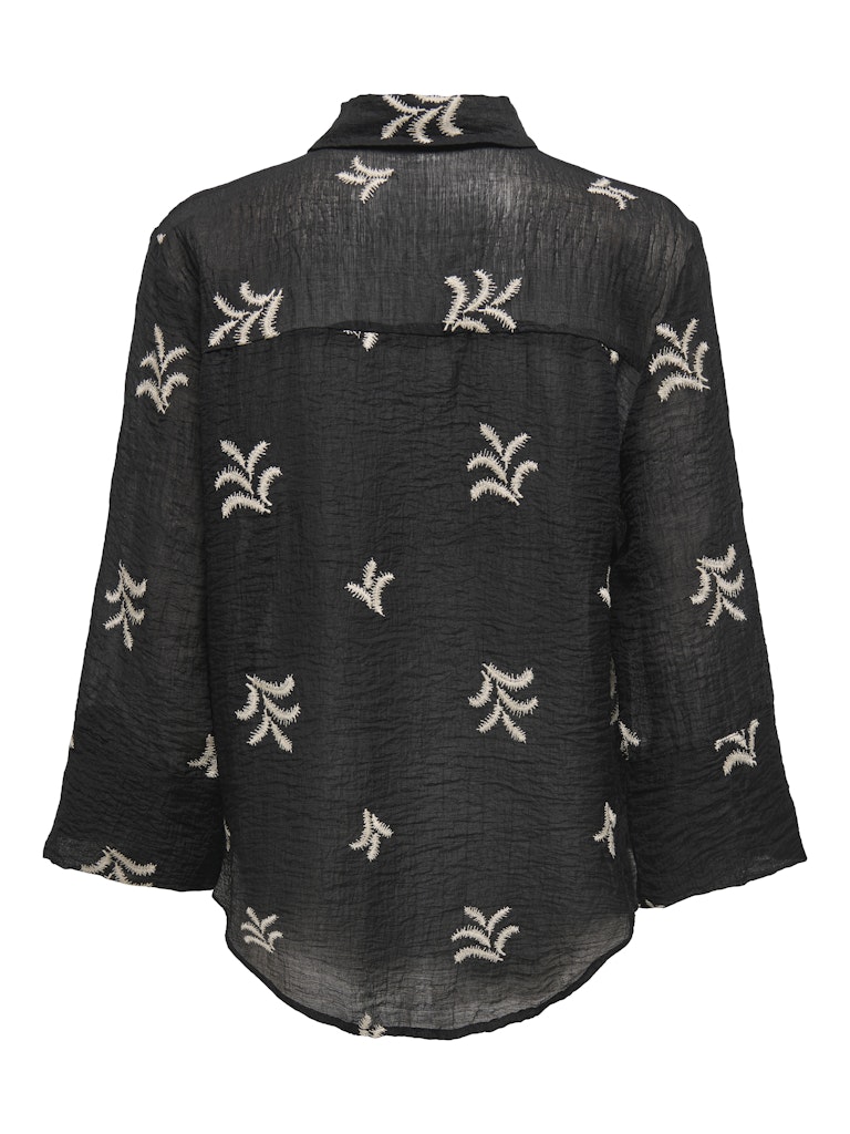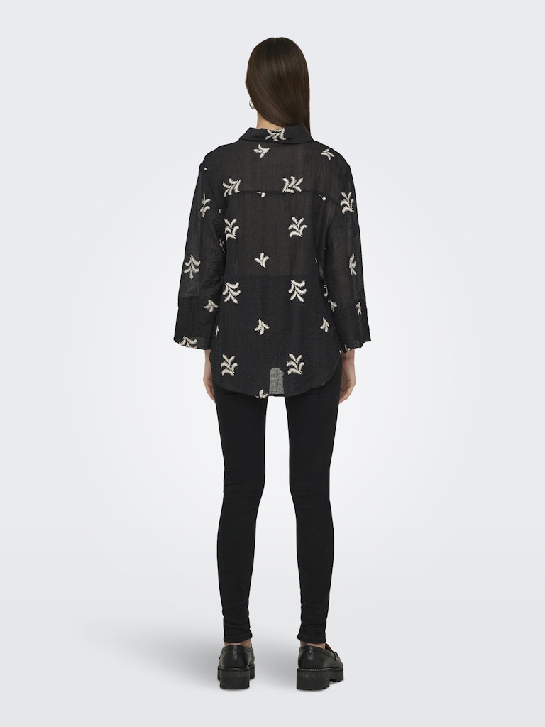 Deze dunne licht doorschijnende blouse heeft een oversized fit en een allover geborduurde print. Hoe ga jij dit pareltje dragen?