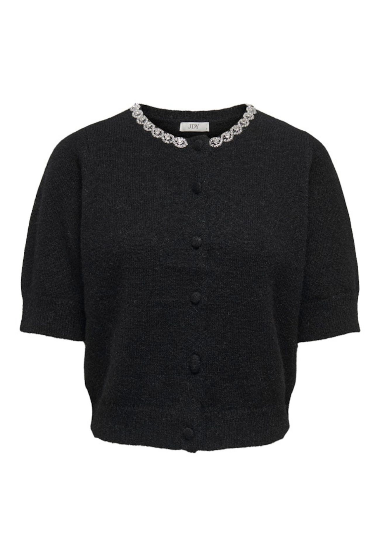 Ontzettend leuk vestje met een klassieke uitstraling door de prachtige strass stenen rond de hals. Dit vestje sluit met stofomklede knoopjes en geeft jou de ultieme preppy look!