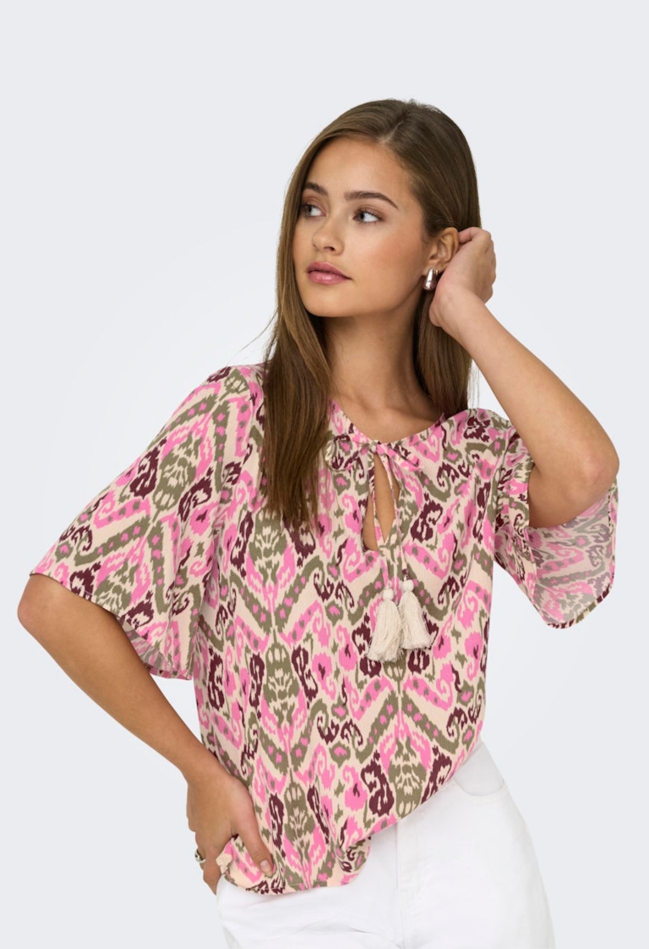Deze dames top is afgewerkt met een charmant strikdetail rond de hals, versierd met speelse kwastjes voor een boho touch. De soepel vallende stof zorgt voor een luchtig en comfortabel draaggevoel. Perfect voor warme dagen. Combineer de top met een denim short voor een casual look, of draag met de bijpassende broek voor een complete en stijlvolle outfit.