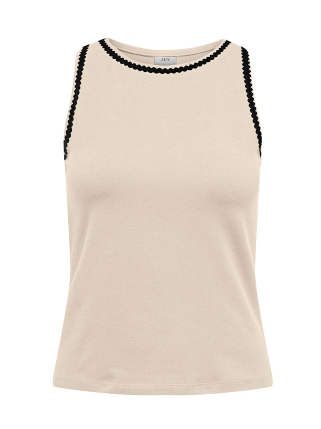 Eenvoudige basic singlet van 95 procent katoen met sierlijke bies. Leuk om zo te dragen maar misstaat ook zeker niet onder een mooie blazer.