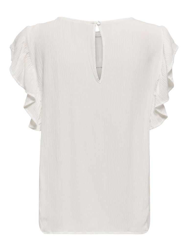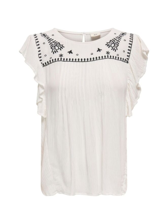 Fraaie top met mooie borduring rond de hals. Dit shirt heeft een mooie ruche rond het armgat en is een uitlopend model door de plooiing op de voorkant. Leuk te mixen en matchen met korte broeken, skorts en rokken! Let op: De top op de foto's heeft een druppeluitsparing op de rug. De top van JDY die wij leveren heeft dit niet maar is verder identiek aan het shirt op de foto.