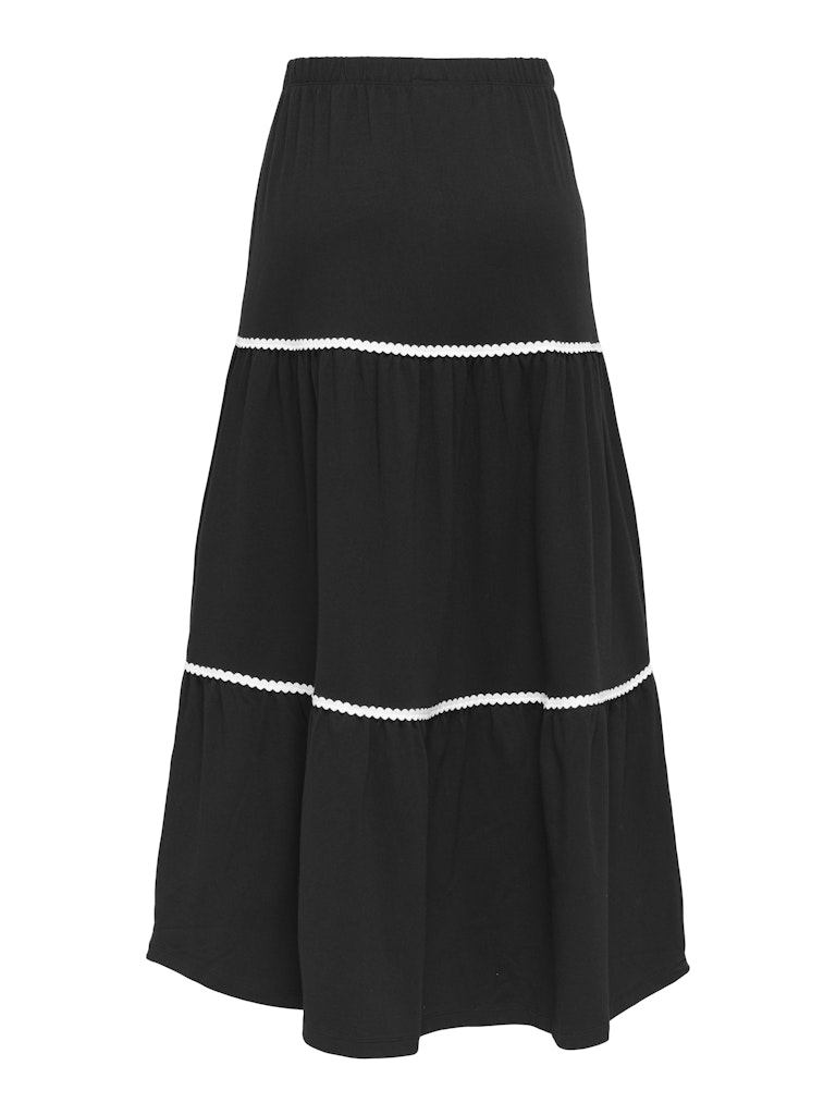 Deze fraaie ruimvallende uiteenlopende rok is een lang model op enkellengte. Met mooie sierbies! Combineeer hem met een effen hemdje en je bent ready to go! Slippertje eronder en klaar!