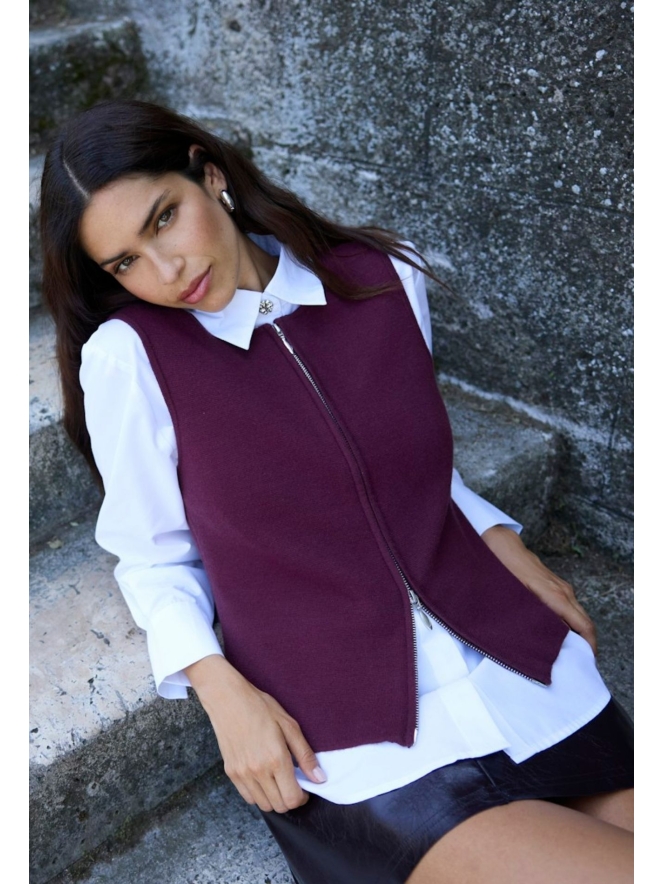 Dit fijn gebreide giletje sluit met een rits. En het mooie van de rits is dat deze ook van onderen open kan. Helemaal trendy is het om er een blouse onder te dragen. Je maakt je look af met een nette pantalon of mooie jeans!