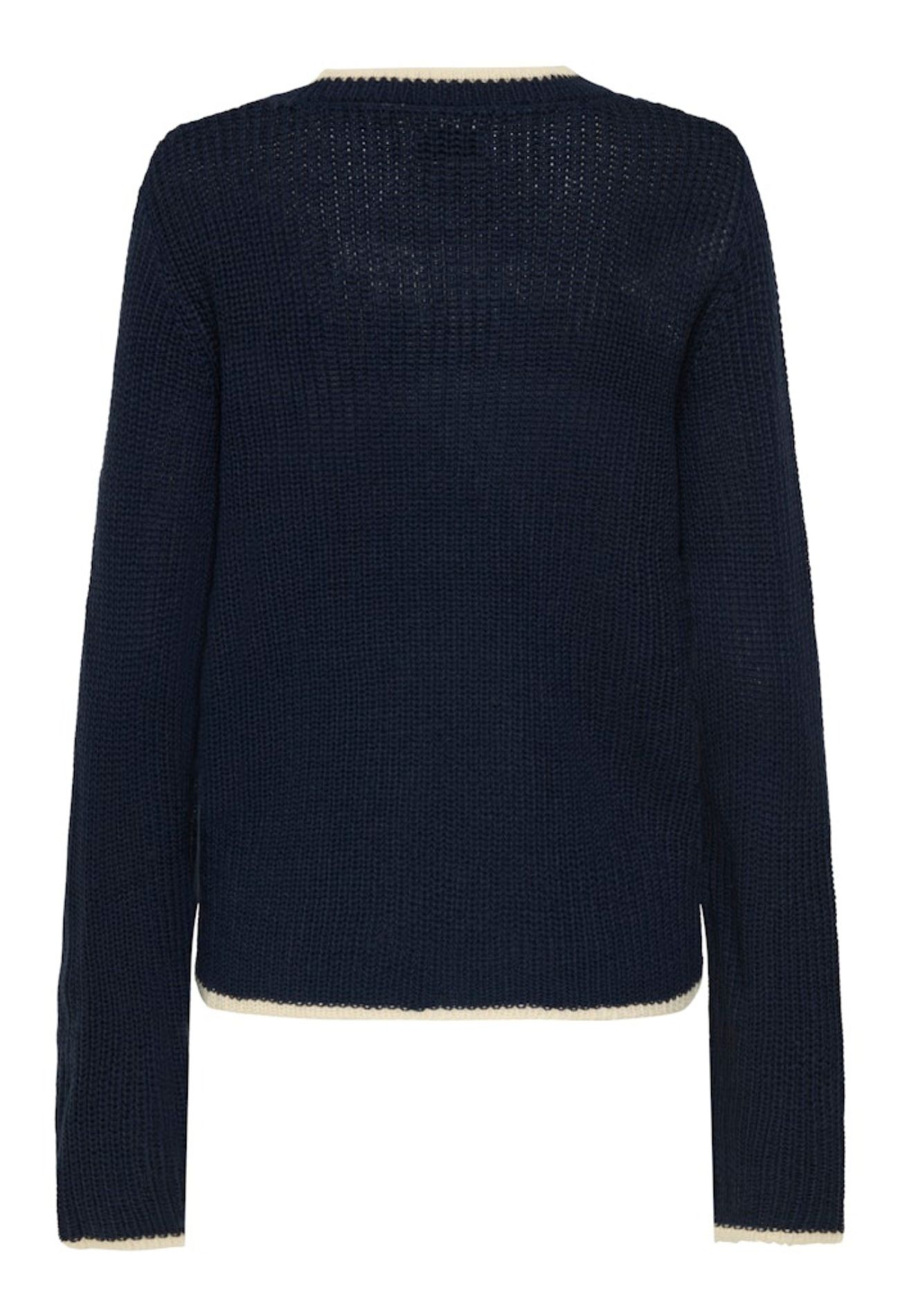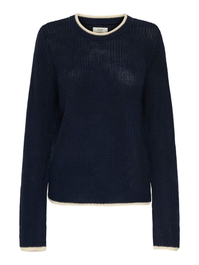 Fijne pullover met een contrasterend lijntje ronde de kraag, mouwen en middel. Dit model valt wat wijder.