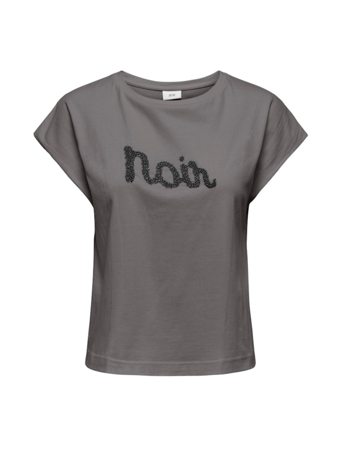 Noir! Trendy basic T-shirt met Noir in kraaltjes. Doet het goed onder een blazer maar staat zo gewoon ook leuk!