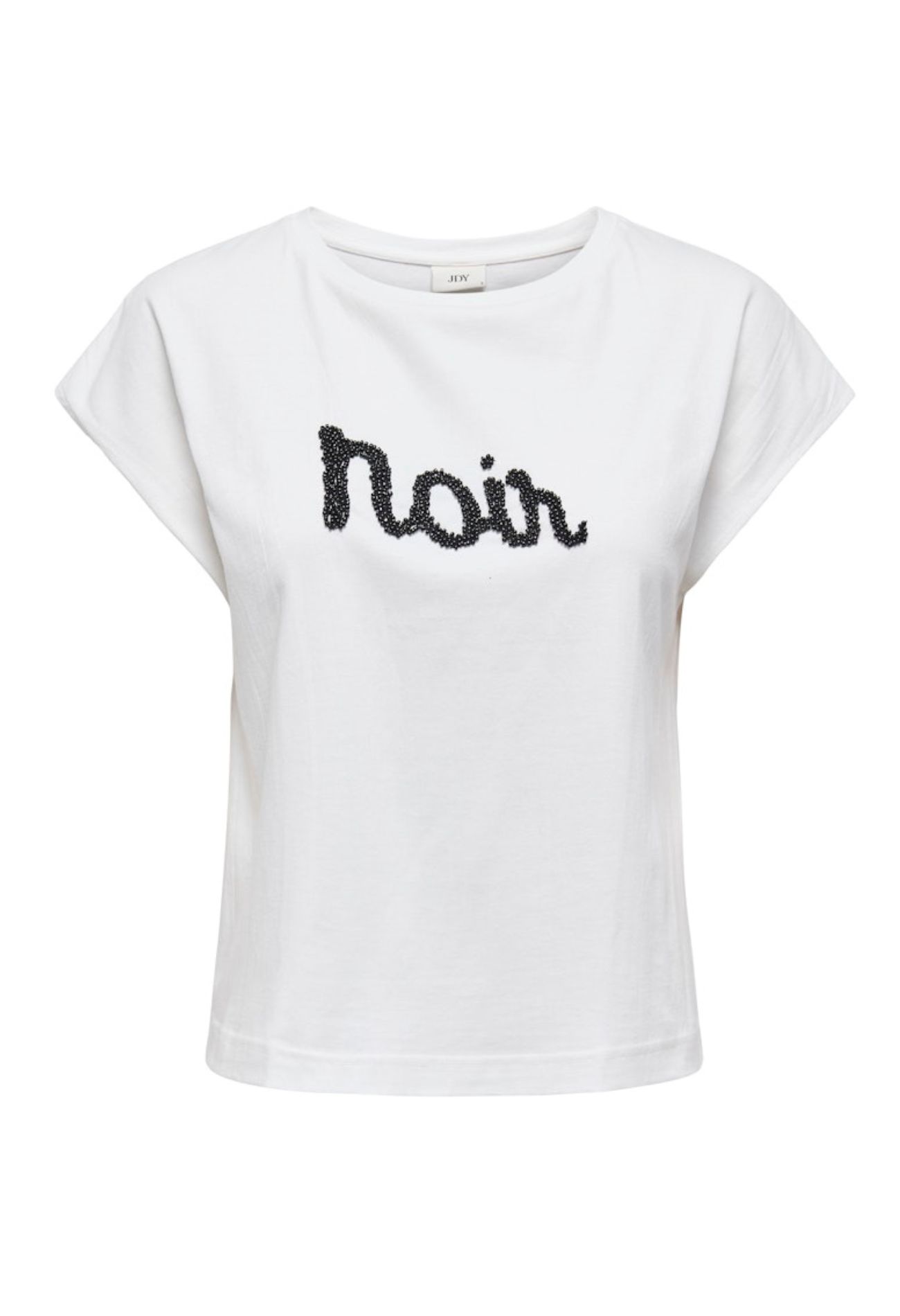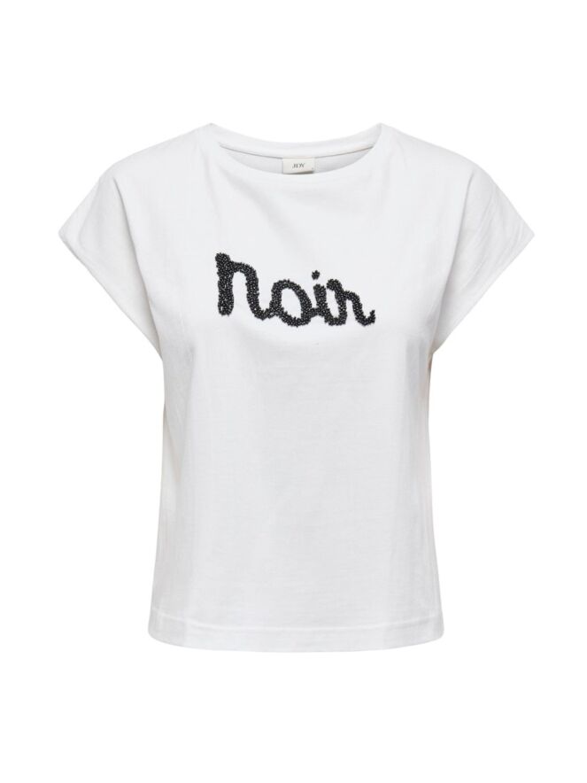 Noir! Trendy basic T-shirt met Noir in kraaltjes. Doet het goed onder een blazer maar staat zo gewoon ook leuk!