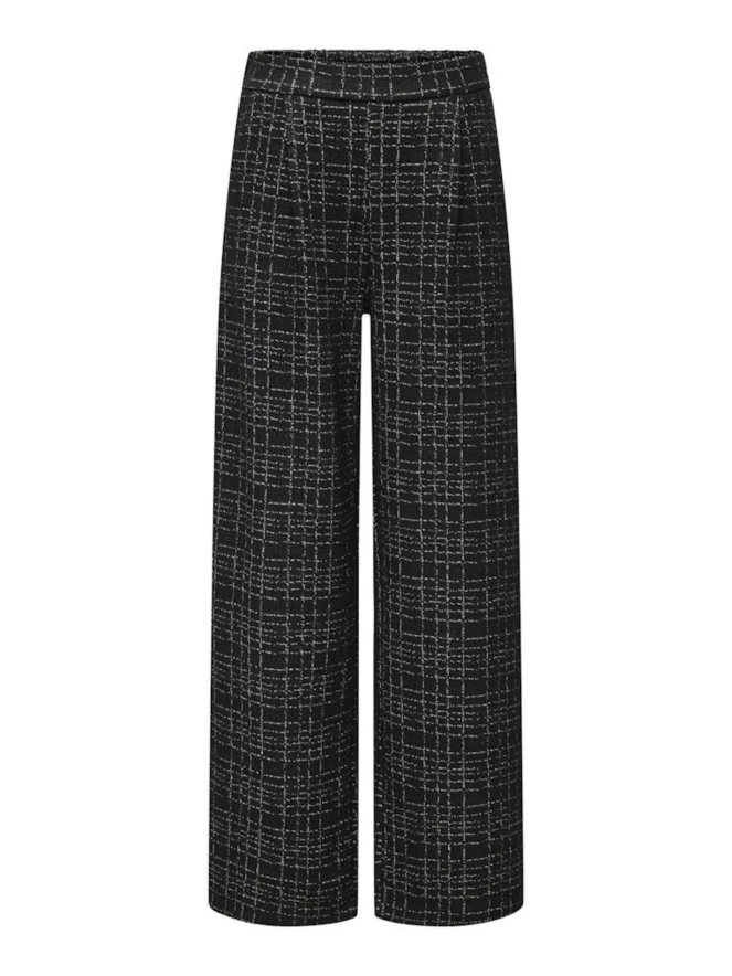 Sjieke pantalon met steekzakken en een bandplooi voor. De stof waar deze broek van gemaakt is is het beste te omschrijven als boucle. Deze broek is een wide fit.