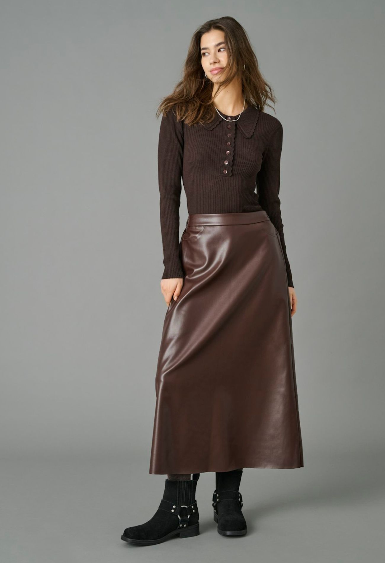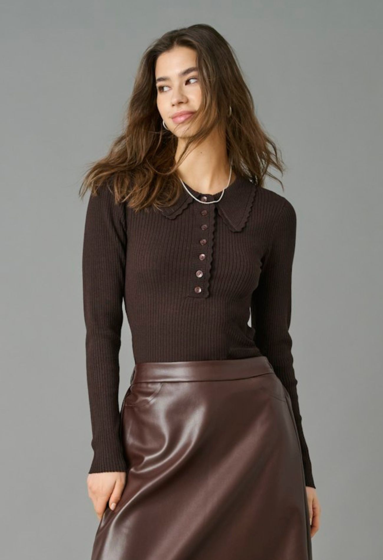 Prachtige pullover met jaren '60 kraagje en afwerking! In de trendy kleur bruin van dit seizoen! Draag het op een jeans voor een casual trendy look!