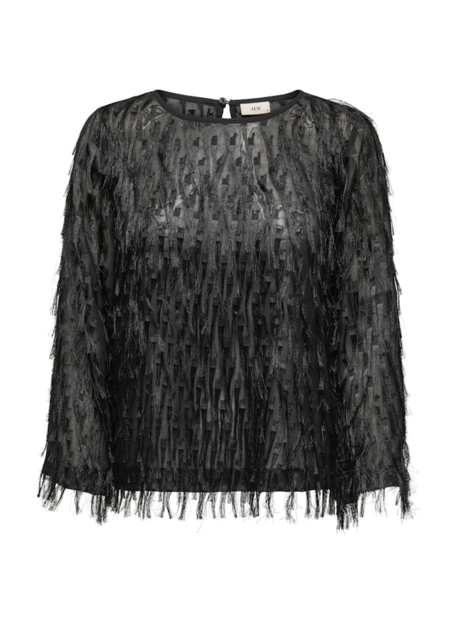 De speelse franjes op de semi-transparante stof dansen subtiel mee bij elke beweging en geven je outfit direct een feestelijke touch. Perfect voor een avond uit of een speciale gelegenheid. Combineer met een zwarte broek of rok voor een stijlvolle, edgy look. Met deze top steel je gegarandeerd de show!