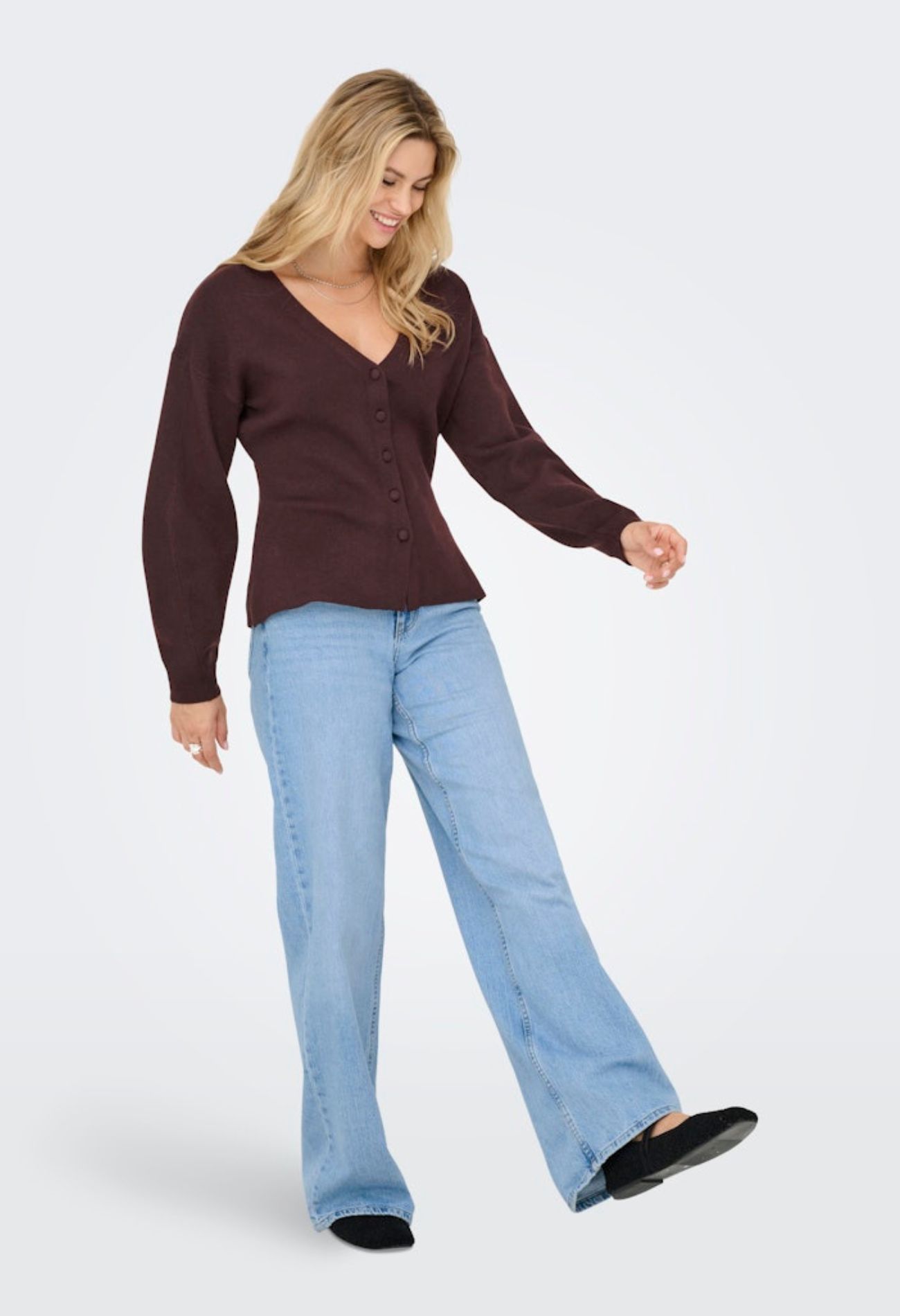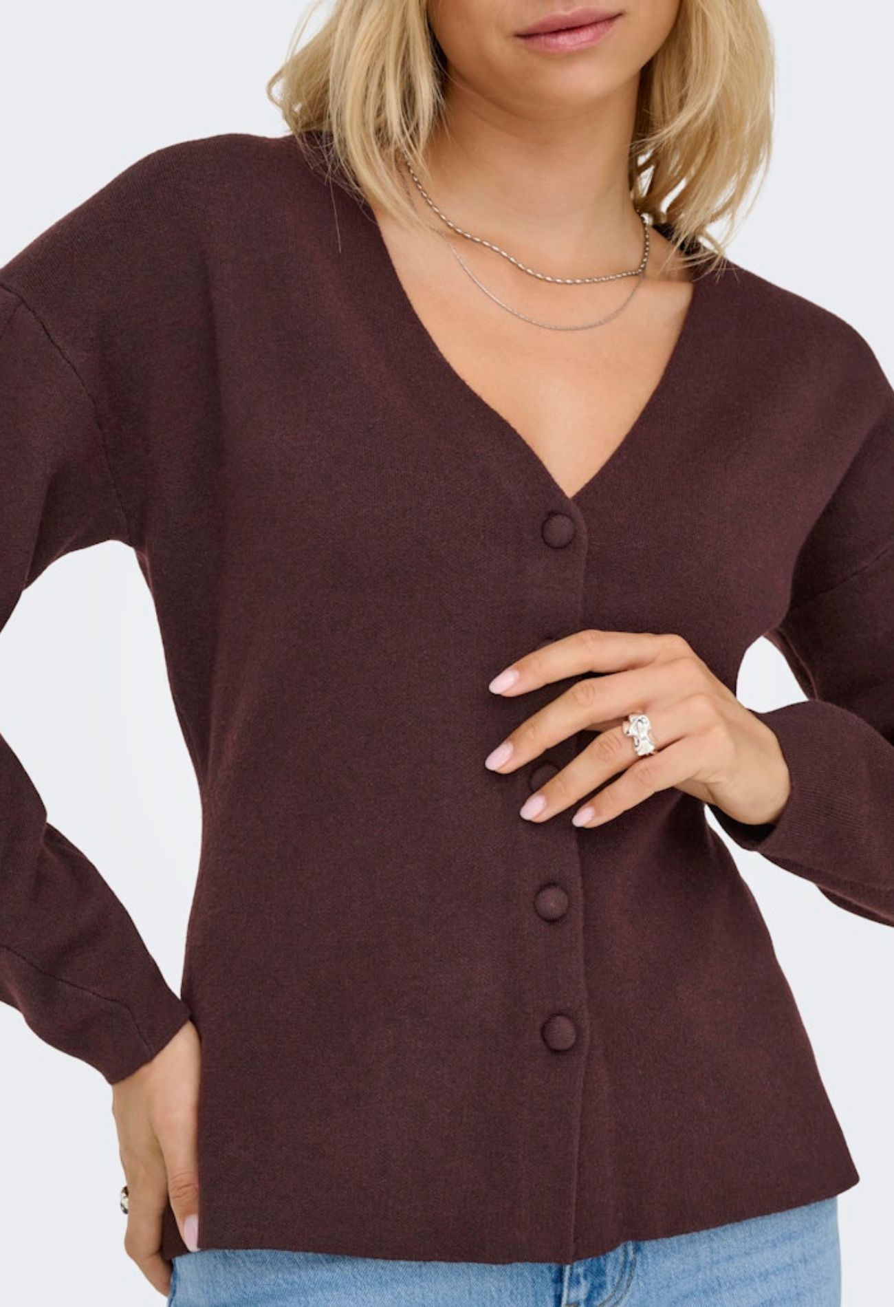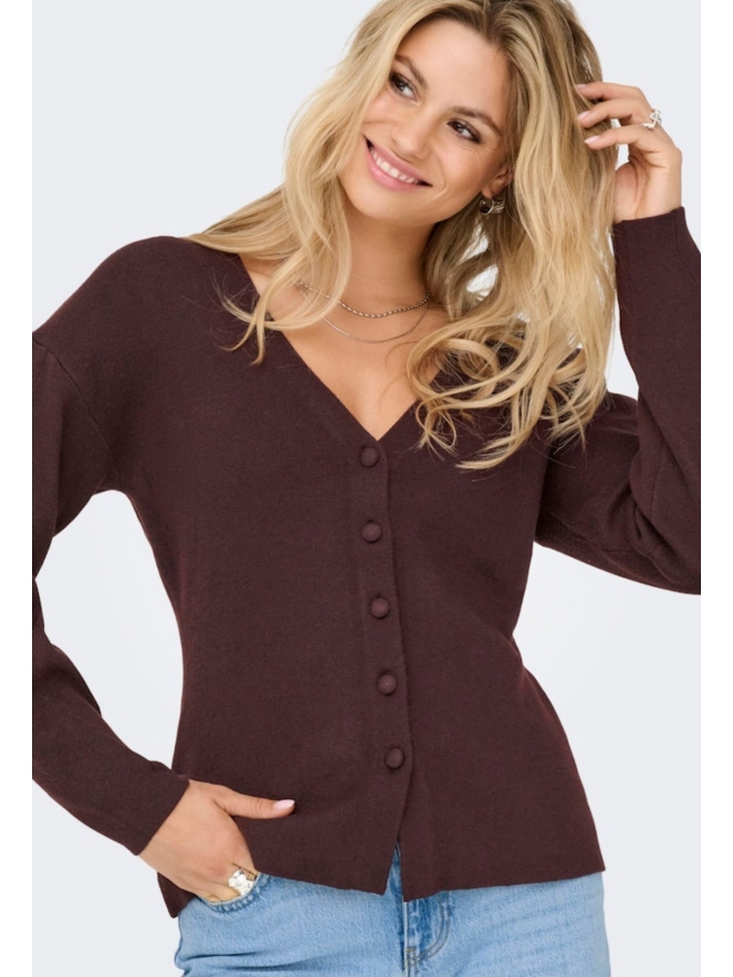 Fijn gebreid vestje met diepe V hals. Sluitend met knopen en heeft een getailleerde pasvorm.