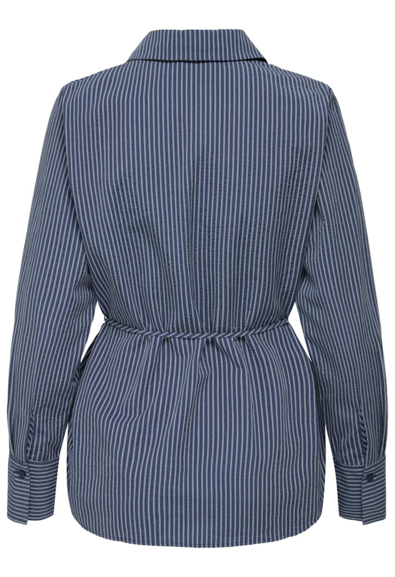 Prachtige streep blouse met een klassieke kraag en mooie V-hals. Dit blousje valt wat ruimer en is langer dan je gewend bent. Met een ceintuurtje in de middel. Helemaal hot en trendy!