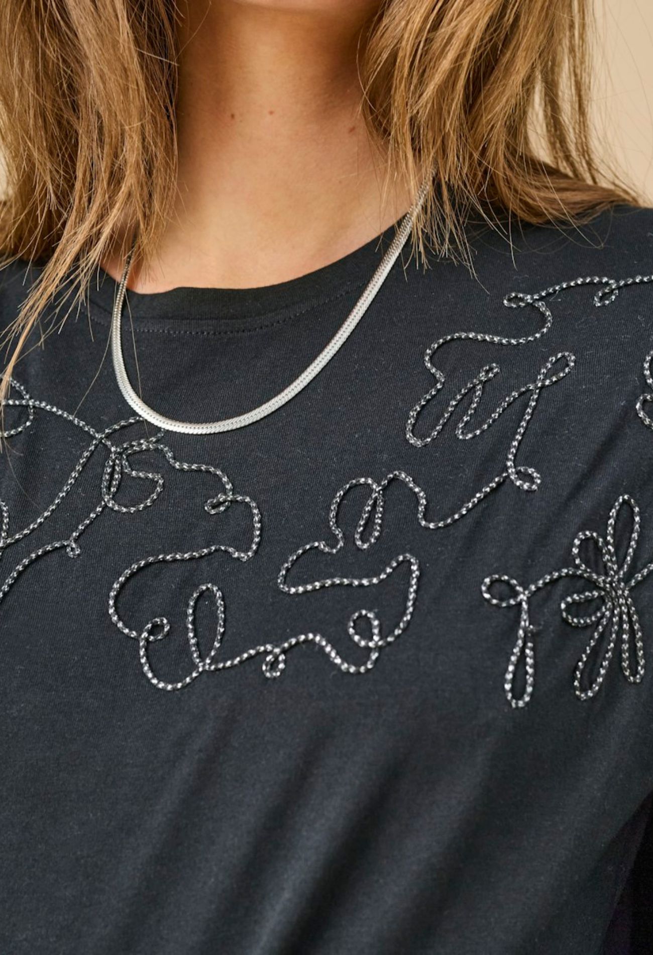 Tijdloos zwart T-shirt met een sierlijk opgestikt koordje.