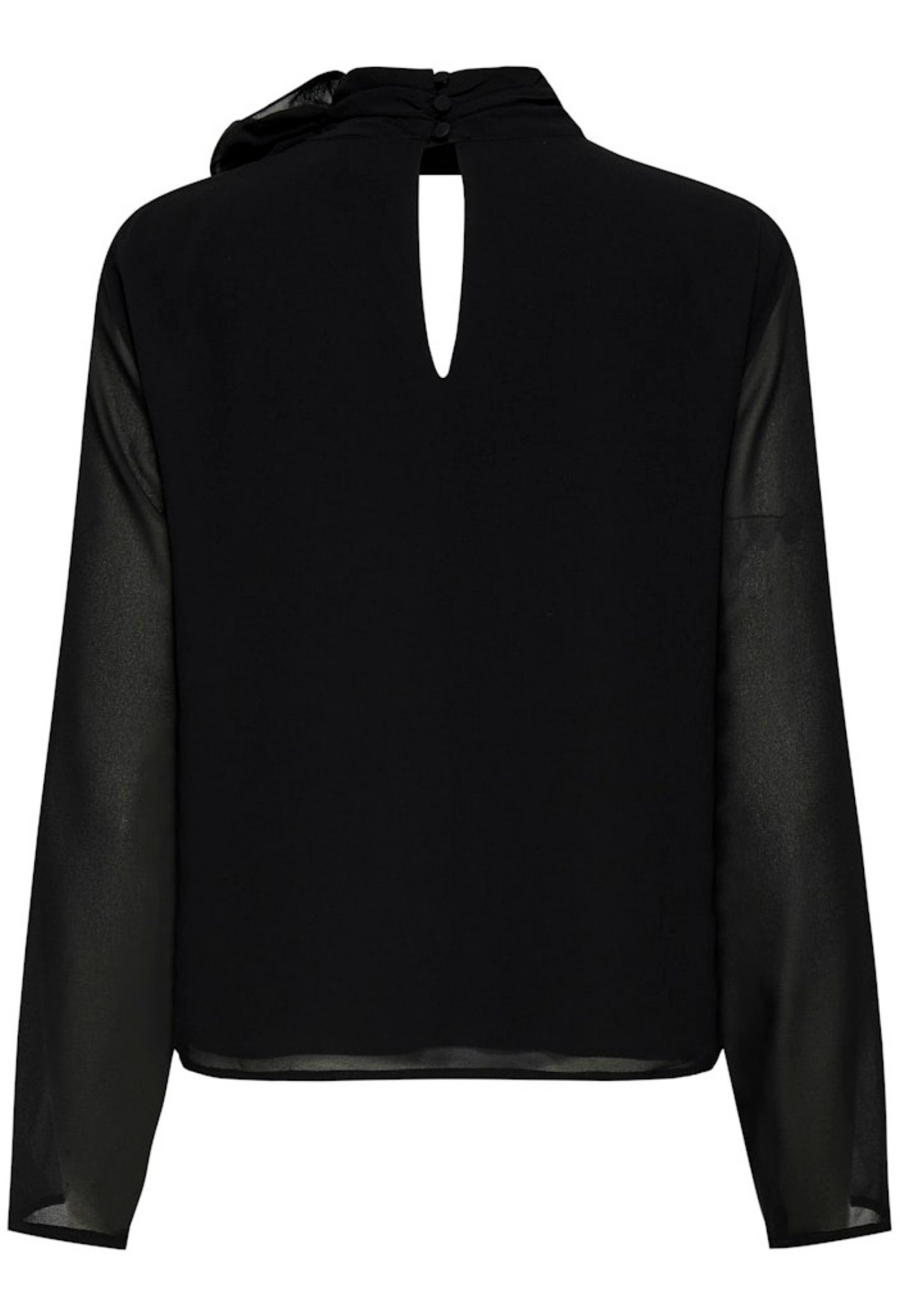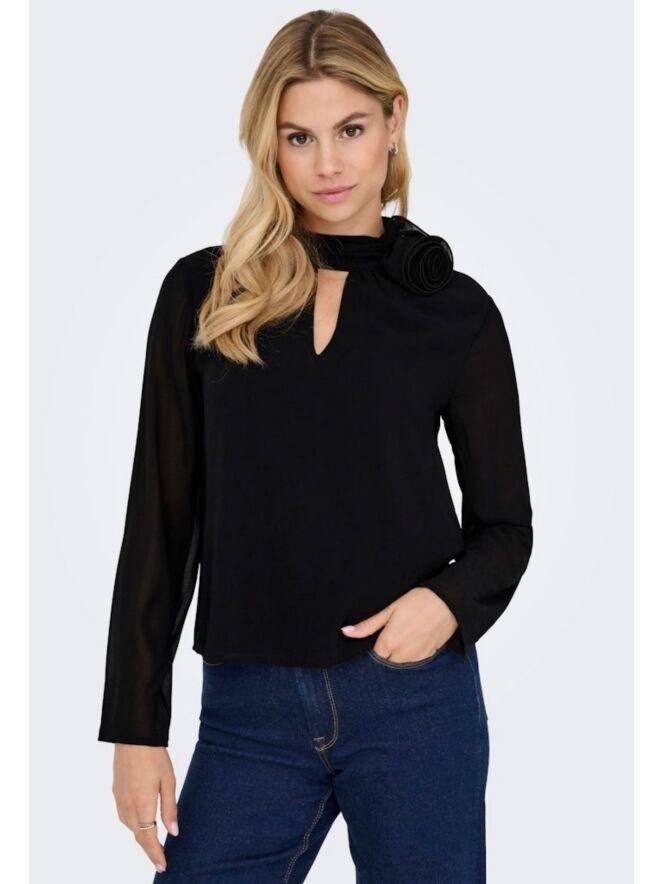 Deze sierlijke en vooral feestelijke top is er in het zwart en ecru. Met de doorschijnende mouwen, V uitsparing voor en achter en niet te missen de bloem is dit een echte blikvanger!