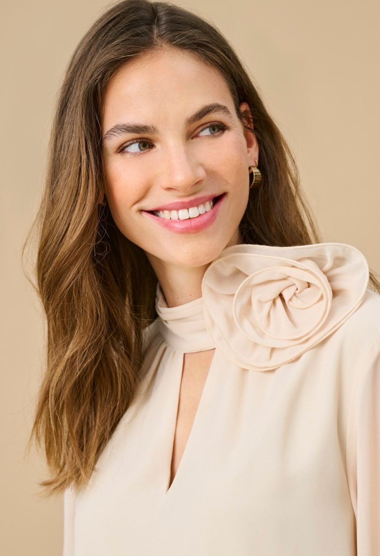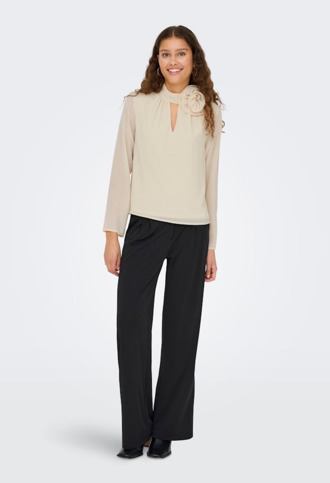 Deze sierlijke en vooral feestelijke top is er in het zwart en ecru. Met de doorschijnende mouwen, V uitsparing voor en achter en niet te missen de bloem is dit een echte blikvanger!