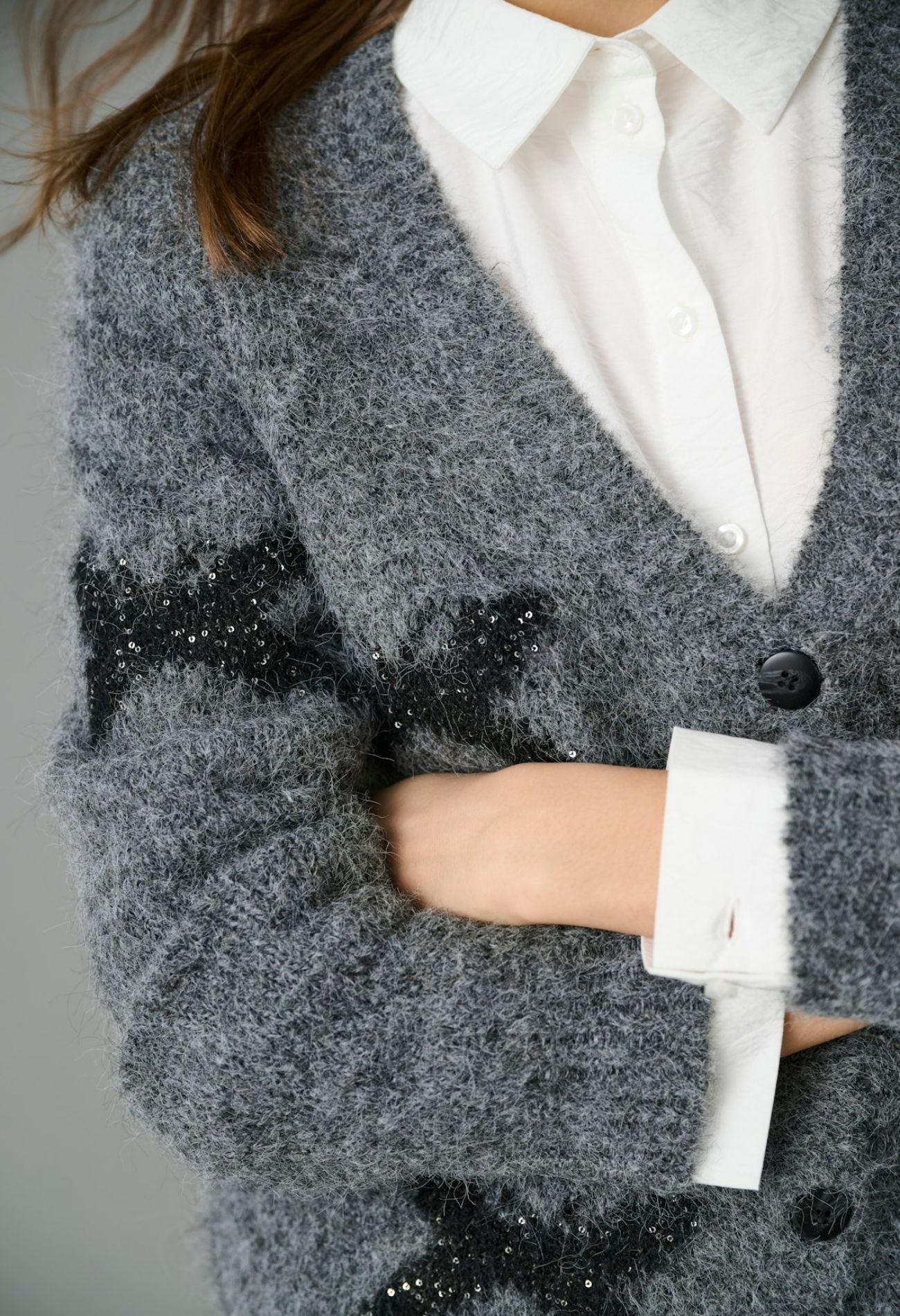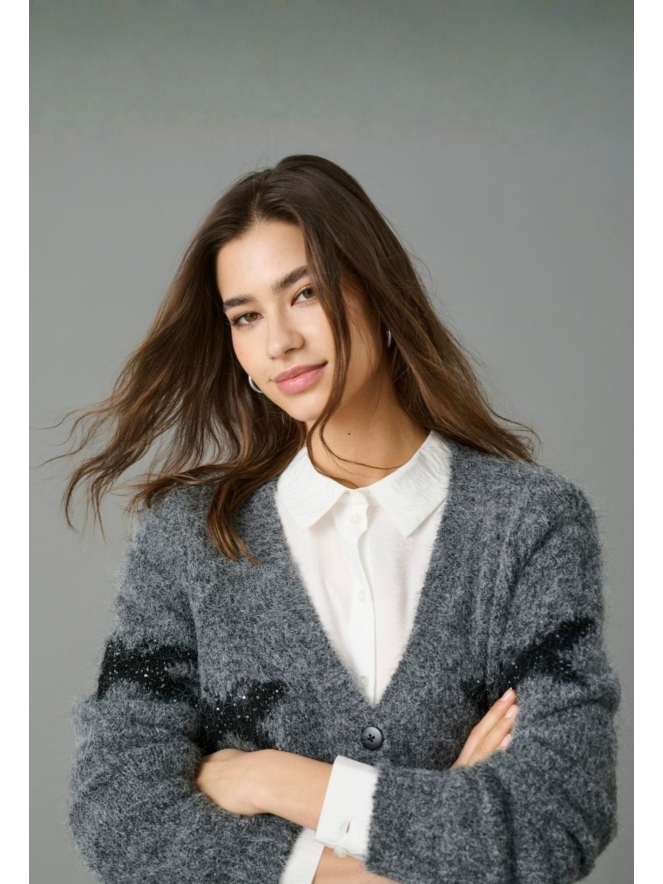 Dit vestje is ontzettend zacht en is pluizig door de featheryarn. De zwarte vlinders hebben kleine glimmende pailletjes.