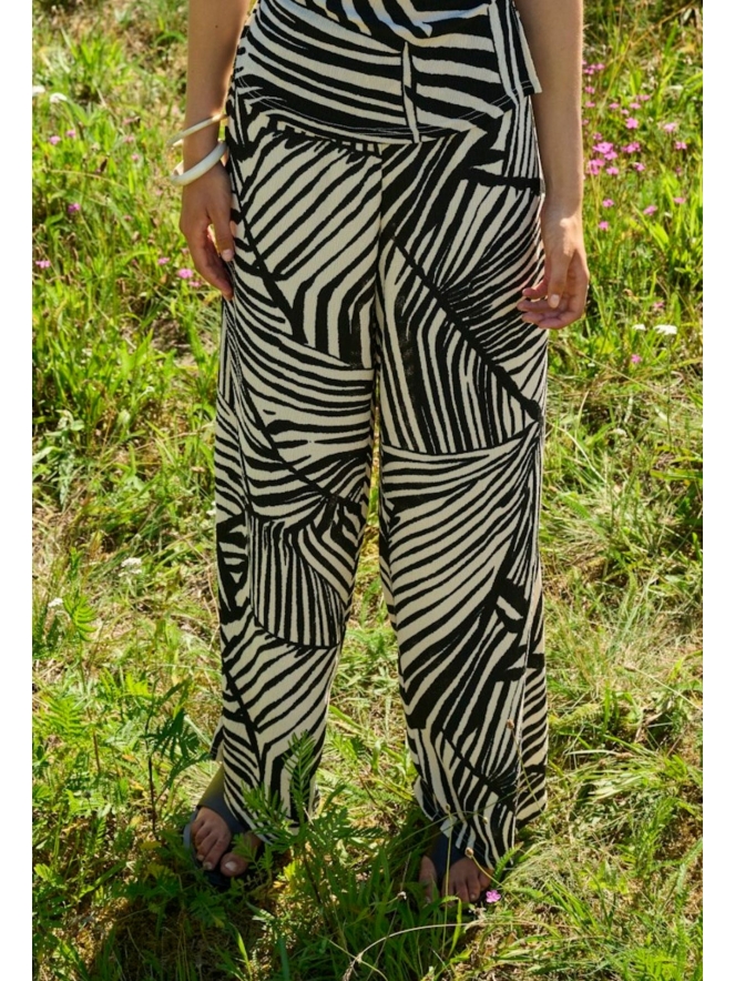 Deze zomerse lange broek is de perfecte combinatie van comfort en stijl. Gemaakt van een luchtige crinkle stof die licht aanvoelt op de huid, ideaal voor warme dagen. De speelse strepen geven de broek een frisse, modieuze uitstraling en maken hem makkelijk te combineren met zowel een eenvoudige top als een opvallender item. Of je nu een dagje naar het strand gaat of een zomerse city trip maakt, deze broek is jouw go-to voor een moeiteloos chique outfit.