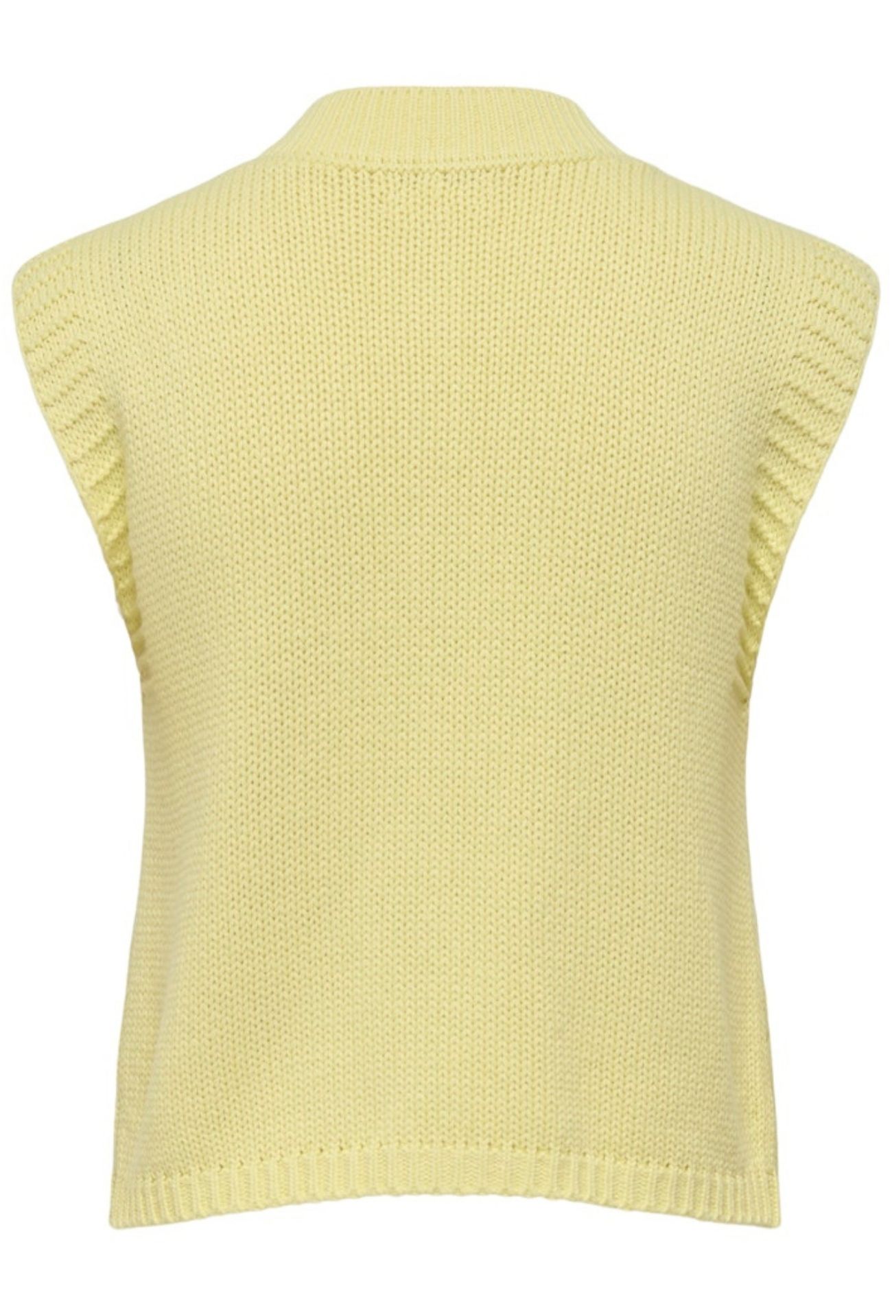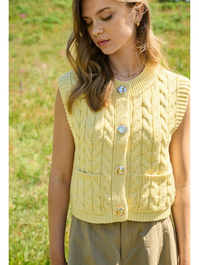 Geef je outfit een frisse en trendy upgrade met dit prachtige gilet in de populaire butter yellow kleur. Deze zachte, warme tint is dé trend van dit seizoen. Het gilet is afgewerkt met luxe goudkleurige knopen die een chique touch toevoegen. De verfijnde kabelstructuur (kabelpatroon) zorgt voor een speelse, maar stijlvolle look en maakt het item perfect voor zowel casual als geklede combinaties. Draag het gilet over een blouse voor een sophisticated outfit, of combineer het met een basic top voor een trendy, effortless look.