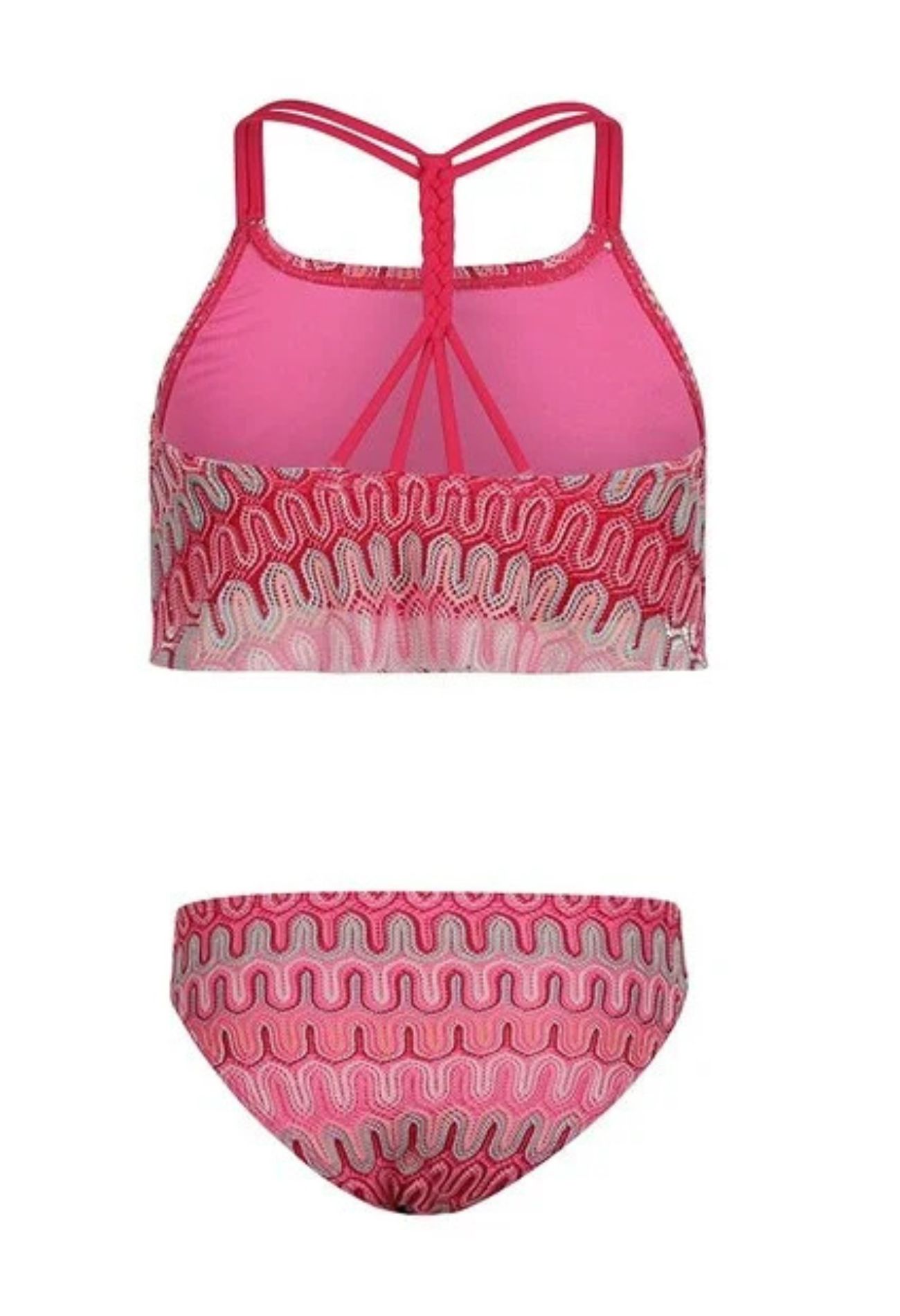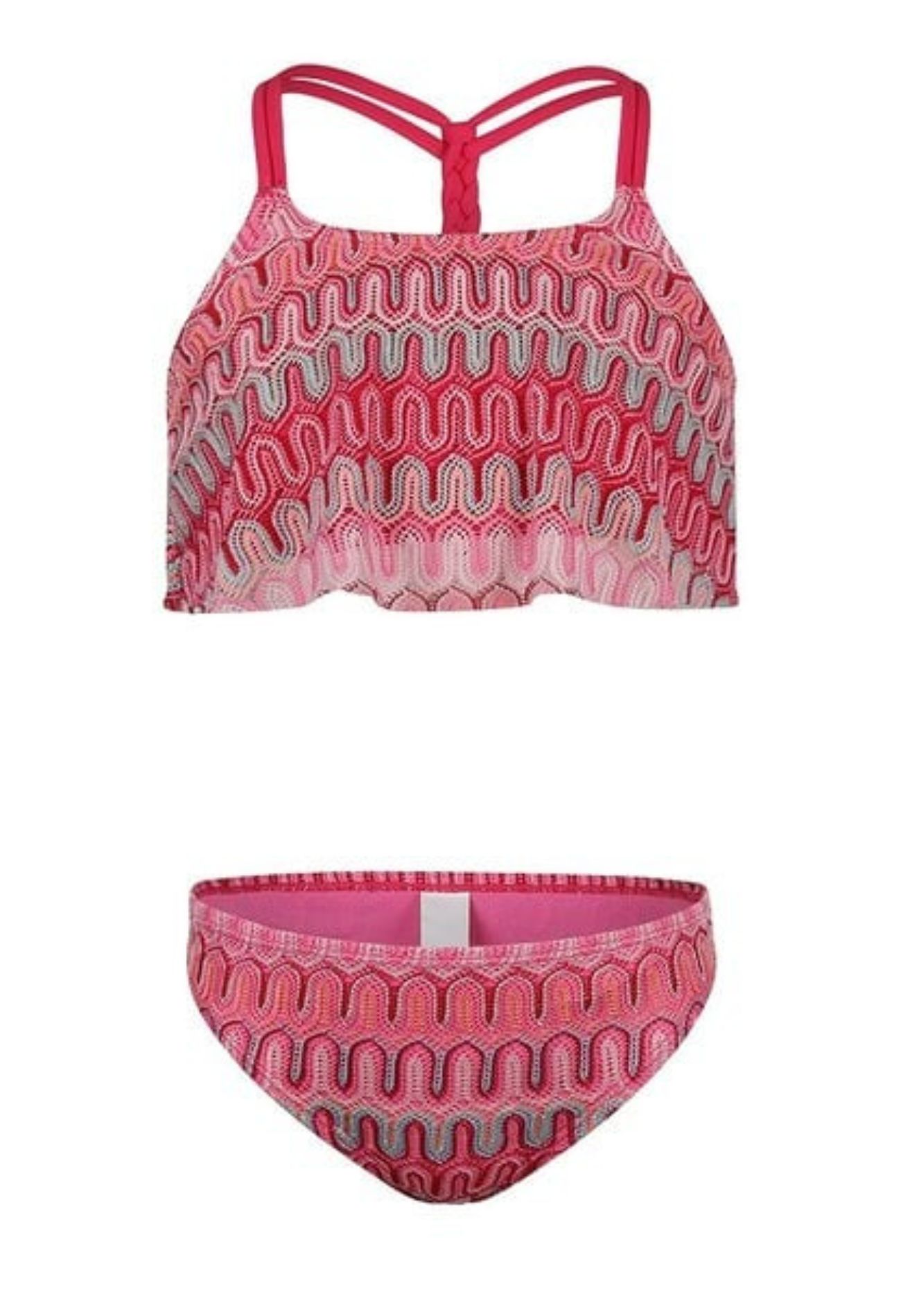 Deze super leuke meerkleurige bikini bestaande uit een broekje en top heeft een leuke los overhangende stof voor een speels effect.