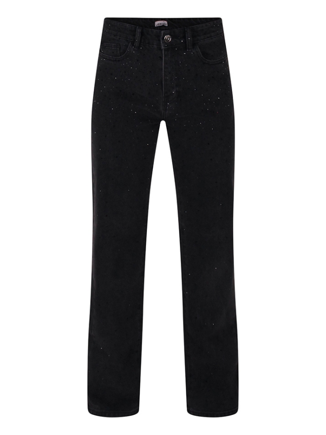 Een echte jeans met zo goed als geen stretch maar wel prachtige zwarte strass stenen over de gehele voorkant. Dus hou jij van een beetje bling? Dan is deze zwarte spijkerbroek voor jou ontworpen! Sluit hoog in de taille en heeft een rechte broekspijp.