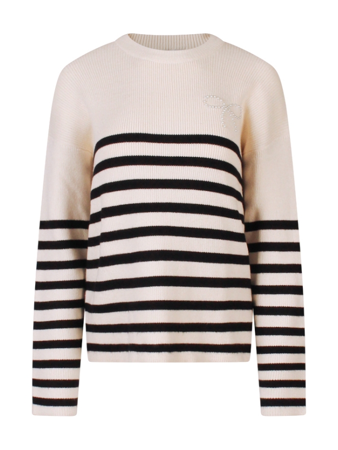 Deze dames sweater is een echte eyecatcher! Het speelse streeppatroon geeft een frisse en casual look, terwijl de strik van parels op de voorkant zorgt voor een trendy en vrouwelijke touch. Gemaakt van een comfortabele stof die zacht aanvoelt, perfect om stijlvol én comfortabel te dragen. Combineer hem met een jeans voor een nonchalante outfit of met een rok voor een verrassend modieuze look.