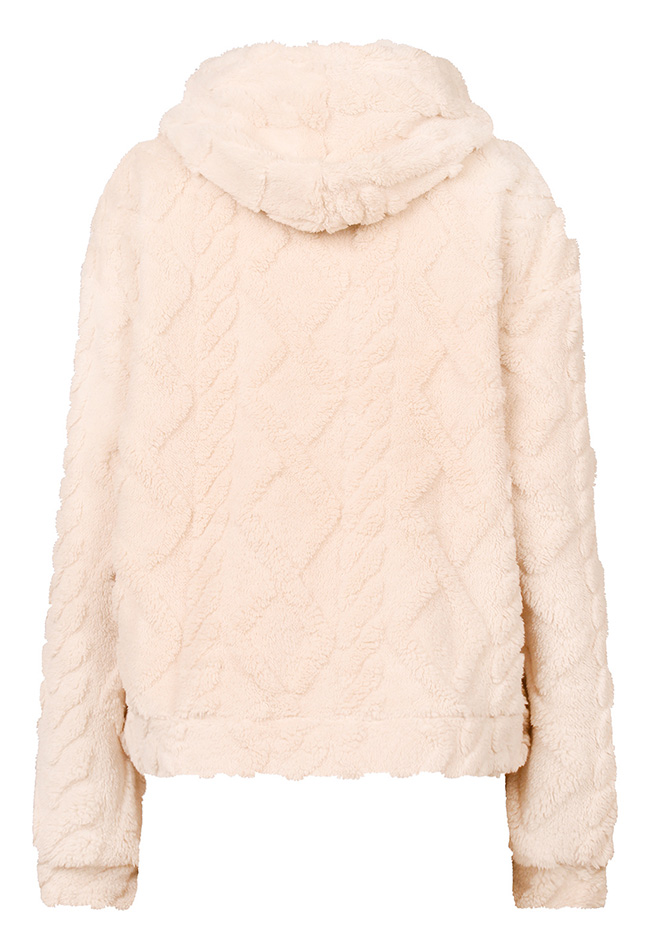 Heerlijk zachte Jacquard fake fur fleece met een mooie tekstborduur voorop. Deze sweater heeft een capuchon en een kangeroezak. Comfortabel en warm!