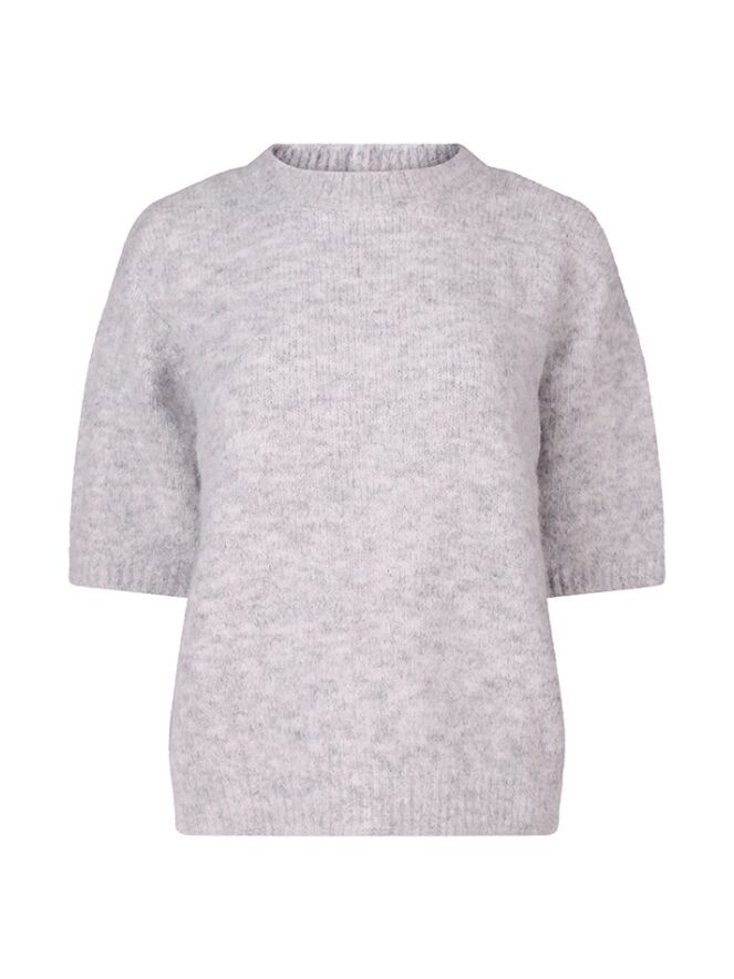 Warme gebreide trui met een wollook en korte mouw. Deze trui bevat 5% wol.