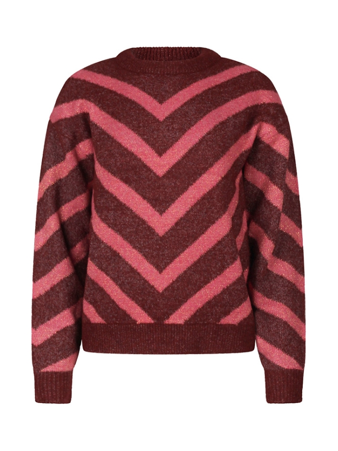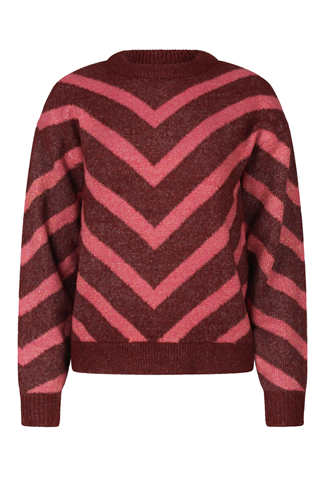 Lekker warme trui met een streep in V-vorm. In de strepen zit een goudkleurige lurex glitter draad verweven. Deze trui is uitermate geschikt om te dragen op alle broeken. Mix en match voor een casual of een meer nette look! Deze trui bevat een klein beetje wol.