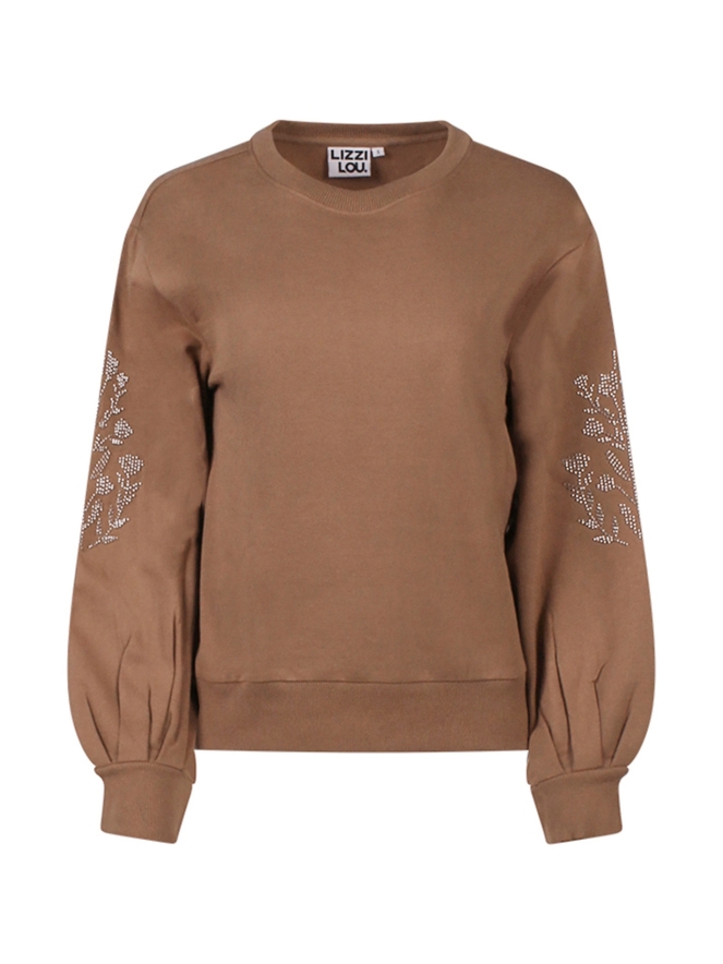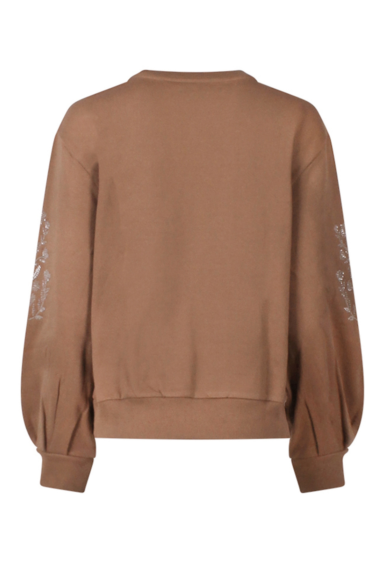 Effen gekleurde sweater met op de pofmouw kraaltjes in een bloemenpatroon. Deze trendy sweater draag je als casual item eenvoudig op jeans.