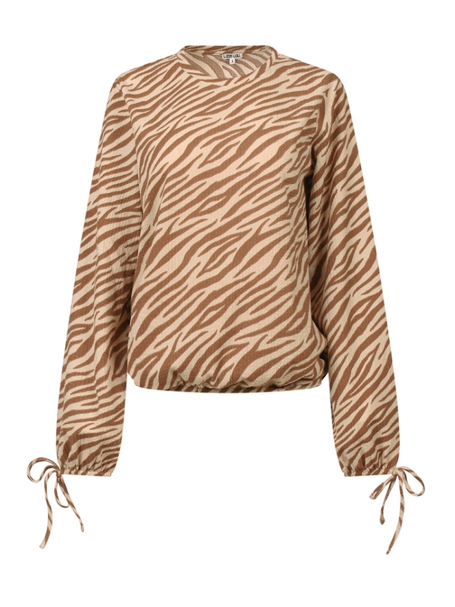 Mooie top van Lizzy Lou in een opvallende zebra print. De top heeft in het uiteinde van de mouwen een koordje en onderin de taille een elastiek.