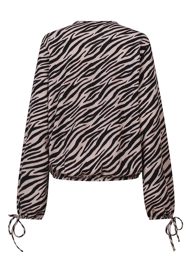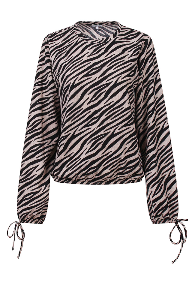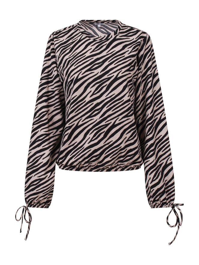 Mooie top van Lizzy Lou in een opvallende zebra print. De top heeft in het uiteinde van de mouwen een koordje en onderin de taille een elastiek.