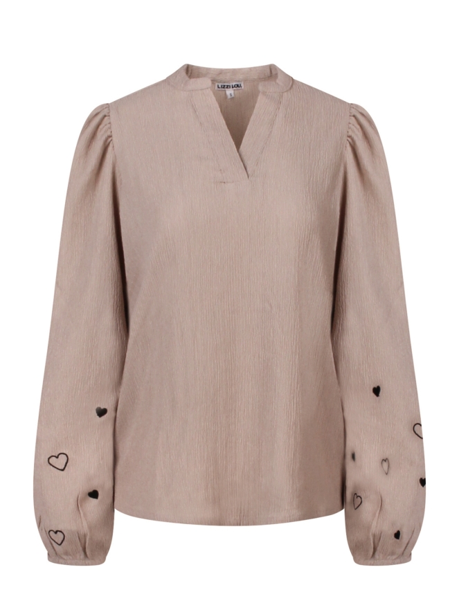 Trendy top van crincle met een kleine V-hals. Deze top heeft een ballonmouw met geborduurde hartjes. Super sweet!