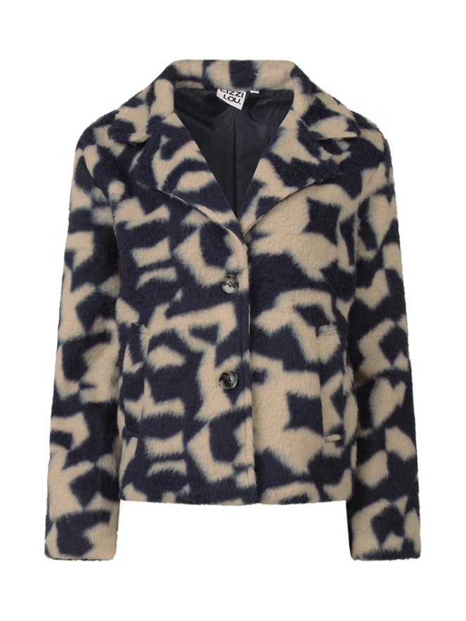 Wollook jasje in een colbertmodel met een grafisch design. Dit jack is nylon gevoerd, heeft twee steekzakken en sluit met knopen. Leuke tussenjas voor een trendy look.