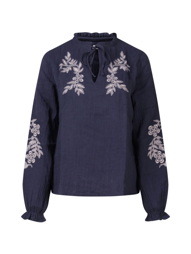Vrouwelijk met een verfijnde touch.Dat is deze mousseline top! Met prachtige verfijnde borduursels op de borst en mouwen. De subtiele ruffel langs de halslijn geeft een romantisch accent. Perfect te combineren met een rok of pantalon voor een nette, stijlvolle look, ideaal voor werk of een speciale gelegenheid.