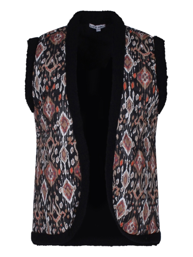 Gestepte gilet van Lizzy Lou met een gebloemd of ikat patroon. Dit giletje is afgebiesd met teddy wat zorgt voor een warme look. Draag het over een T-shirt of leuke top op rok of broek. Je kan zoveel kanten op!