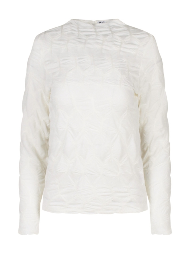 Fancy top met relief in de stof, sluit hoog door de turtleneck en heeft een kleine druppeluitsparing achter in de hals met een knoopje. De relief stof rekt lekker mee maar ziet er op z'n best uit als hij niet op spanning staat. Bestel daarom gerust een maatje groter!