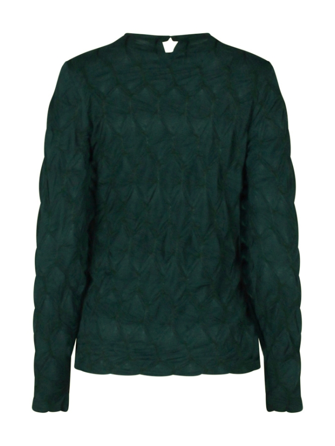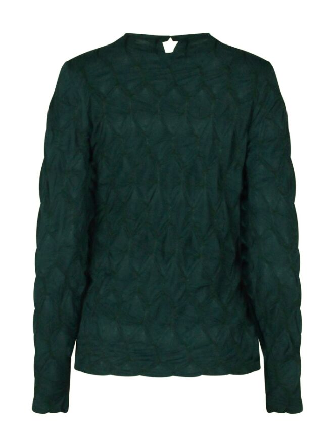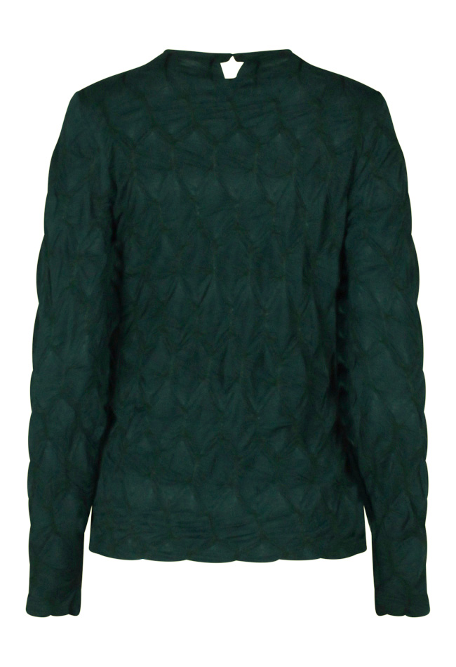 Fancy top met relief in de stof, sluit hoog door de turtleneck en heeft een kleine druppeluitsparing achter in de hals met een knoopje. De relief stof rekt lekker mee maar ziet er op z'n best uit als hij niet op spanning staat. Bestel daarom gerust een maatje groter!