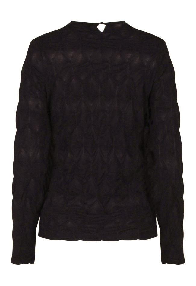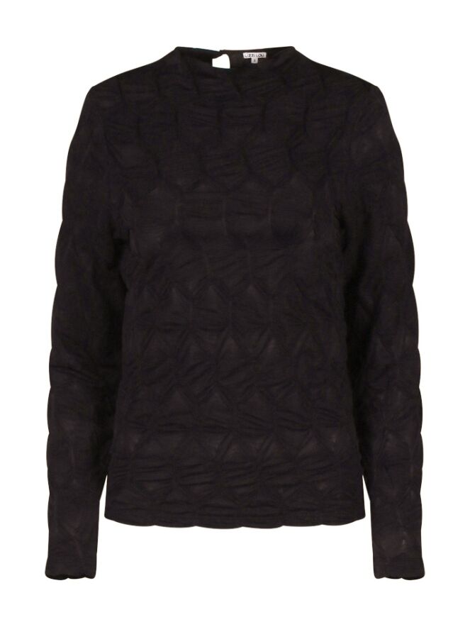 Fancy top met relief in de stof, sluit hoog door de turtleneck en heeft een kleine druppeluitsparing achter in de hals met een knoopje. De relief stof rekt lekker mee maar ziet er op z'n best uit als hij niet op spanning staat. Bestel daarom gerust een maatje groter!