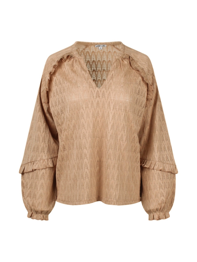 Deze top van Lizzy Lou gemaakt van structuur jersey is een doorschijnend, wijdvalllend model. Leuk detail zijn de ruches die over de schouderpartij lopen. Draag er een hemdje of shirtje onder met spijkerbroek, leuke rok met sneakers of wat jij maar leuk vind en je bent ready to go!