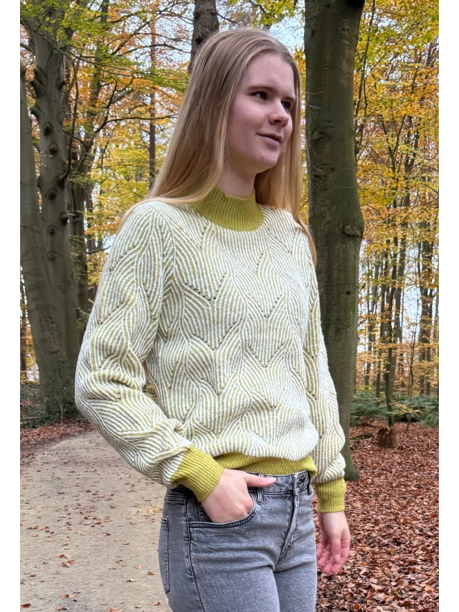 Fraaie trui met warme turtleneck en apart two-tone patroon wat deze trui in sweater model net even anders maakt. Draag hem op een leuke rok of jeans voor een comfortabele casual uitstraling.